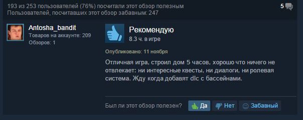 warp 37 Ох, опять фанбойское оправдание. Стимовские вон тоже не в восторге). Вот обзор, который в топе обзоров фола: Отличная игра, строил дом 5 часов, хорошо что ничего не отвлекает: ни интересные квесты, ни диалоги, ни ролевая система. Жду когда добавят dlc с бассейнами. http://steamcommunity.com/id/antoshabandit/recommended/377160/ P/S Меня уже в топе опередили, там это в виде картинки, наглядненько