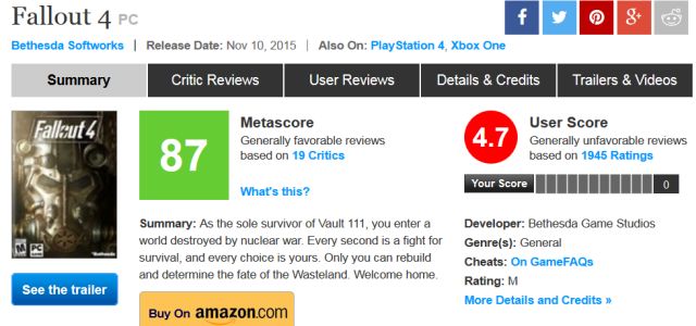 Как оказалось многим вечно чем-то недовольным пользователям сайта Metacritic не нравится не только Call of Duty: Black Ops III. Ролевая игра Fallout 4 тоже вызвала волну негатива со стороны аудитории. На данный момент средняя оценка пользователей РС-версии игры составляет всего 4,7 балла из 10 при почти двух тысячах проголосовавших. Средняя пользовательская оценка издания для PS4 равна 5,5/10 (более 1000 голосов), для Xbox One – 5,3 (более 500 голосов).