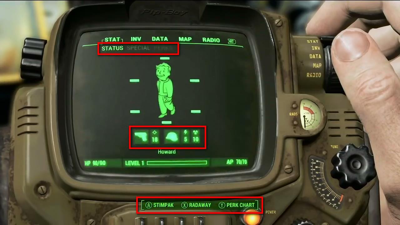 Ниже вы можете видеть Pip-Boy четвёртой модели. Обратите внимание, что у игрока отныне нет привычных навыков. На главном экране нам сразу показывают боевые параметры, а так же позволяют, не листая экраны, съесть стимпак/антирадин или перейти к перкам (видимо, чтобы при повышении уровня быстрее переходить к самому вкусному). Крафтинг оружия и постройка поселений требуют определённых перков. С простыми задачами справится любой персонаж, но что-то более серьёзное потребует особый перк.