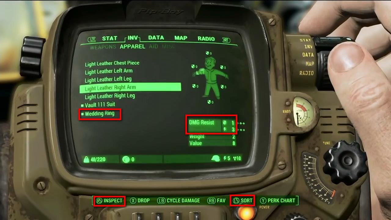 На скриншоте ниже можно заметить, что в игре реализован принцип двухслойной брони, прямо как в Dragon’s Dogma. Игрок может одеть на себя костюм Убежища, в сверху облачиться во что-то более массивное. Кроме того, на палец протагониста одето обручальное кольцо. Видно, что защита теперь делится на физическую и энергетическую, а от радиации «кожанка», естественно, не защищает. Вдобавок, можно INSPECT’ить вещи (видимо, как в Skyrim — повертеть перед собой), и сортировать их.