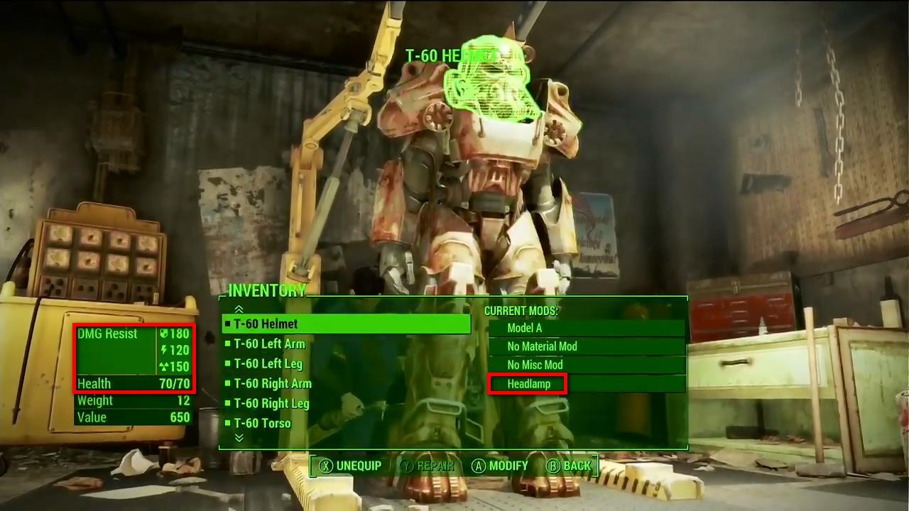 Силовая броня. У неё есть все три типа защиты и (единственный предмет из всех, который имеет этот параметр) прочность. На шлем устанавливается фонарь, однако есть вероятность, что будут и другие «примочки», вроде типа инфракрасного сканера, подобного тому, что игроки могли видеть в модах для Fallout 3. Судя по числам, указанным в многочисленных параметрах, от которых персонажа игрока будет защищать доспех, нас ждёт не процентная система из третьей части и не «порог урона» из New Vegas, а что-то совершенно новое. Слишком уж велики эти значения.