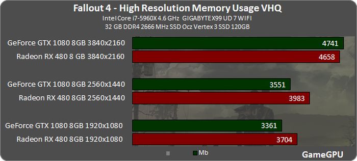 При наличии системы с 8 гигабайтами Fallout 4 потреблял 5.3 гигабайат ОЗУ. При наличии системы с 12-ти гигабайтами потребление ОЗУ всей оперативной памяти составило 6 гигабайт. С системой на 16 гигабайт потребление общей памяти составило почти 6.4 гигабайта. И при наличии 32 гигабайт оперативной памяти система потребляет 6.7 гигабайта ОЗУ.
