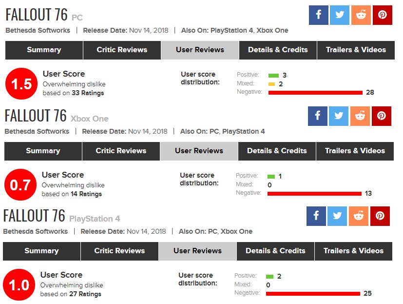 Fallout 76 получает первые оценки игроков на Metacritic по всем трем платформам. Как правило рейтинг установленный в первые дни определяет его навсегда. Незначительные колебания возможны, но едва ли это поможет новому проекту от Bethesda. Рейтинги игровых изданий пока не опубликованы, но скорее всего будут выше. Данное явление уже давно преследует Metacritic, когда оценка игроков сильно разнится с оценкой изданий. Обе стороны вполне могут оказаться необъективными в своих вердиктах исходят из некоторых конспирологических теорий, доказательств которых никто никогда не видел - так называемые "чемоданы" (денег, прим. КЭПа) для изданий и набеги игроков-хейтеров для искусственного снижения рейтинга.