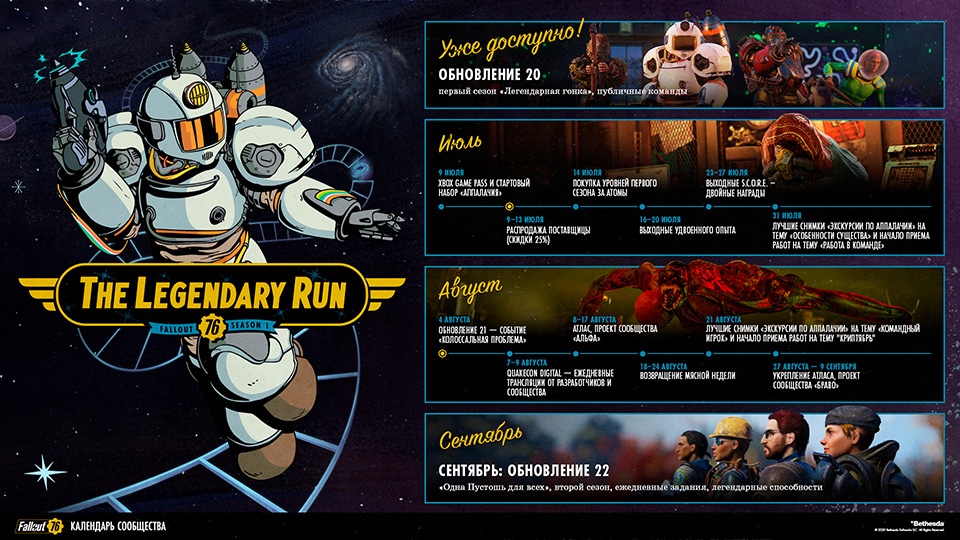 С вами вновь «Вести из Убежища»! Лето в самом разгаре, и на этой неделе разработчики поделятся с вами самыми горячими новостями Fallout 76, и поговорят о нововведениях, включении Fallout 76 в Xbox Game Pass и очередном этапе тестирования на публичном тестовом сервере. Кроме того, разработчики опубликовали новый календарь сообщества, где рассказали о своих планах вплоть до сентября.