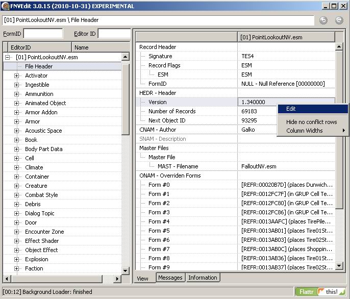 Мастер-файл мода делался под игру с установленным 7-м апдейтом и имеет номер версии 1.3400 ! Чтобы использовать данный файл в игре с предыдущими апдейтами ( от оригинала до 6-го апдейта) необходимо через программу FNVEdit изменить номер версии мастер-файла PointLookoutNV.esm (см. скриншот)