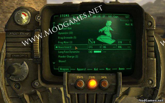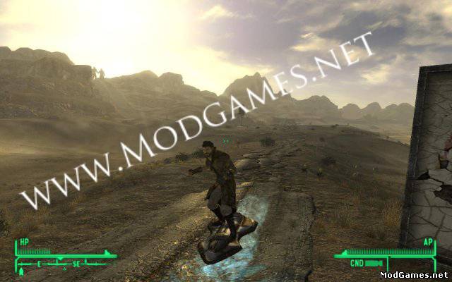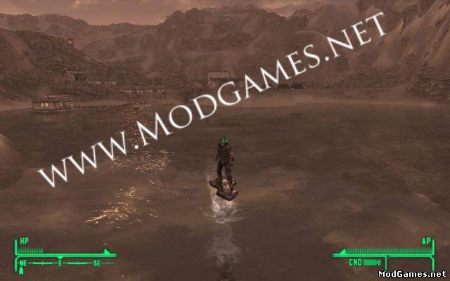 Мод добавляет Парящую доску, на которой можно быстрее перемещаться по пустоши, парить над водой и пролетать через "невидимые стены", которых излишне много в Вегасе (мне лично сразу не понравилось то, что забраться на гору и по ней пройти можно было бы, но стена, из-за которой километров 5 обходить приходится).