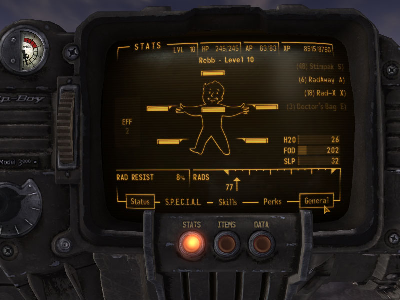 - Объединяет вкладки состояния персонажа, индикаторы радиации, голода, жажды и сна в разделе "Статус"
