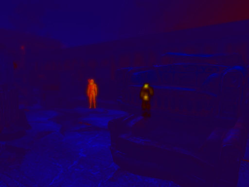 Подрежим 1: FLIR. В этом подрежиме температура отображается не цветами, а градациями серого (как в военных тепловизорах) - это позволяет лучше различать местность. В этом подрежиме нельзя видеть нпц сквозь стены.