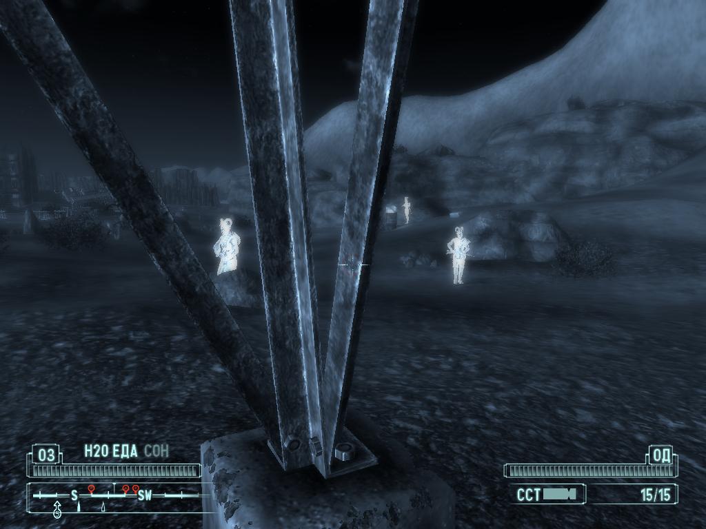 Режим 1: Теплосканер. Выдаёт псевдотепловое изображение местности. Можете считать это комбинированным вариантом обычного и инфракрасного спектра. Так можно читать надписи даже не смотря на то, что видится температура местности. Так же позволяет частично видеть нпц и животных сквозь стены.