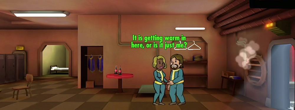 - Путешествия в пустоши — возможность отправлять персонажей на разведку. Механика игры делает это через текстовое окошко, где описываются произошедшие с персонажем события. Интересный момент, благодаря которому игрокам приходится следить не только за убежищем, но и за внешним миром.