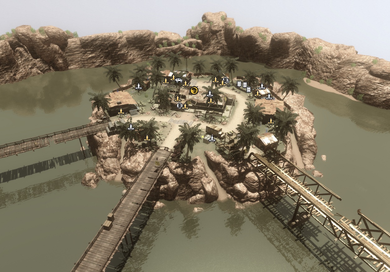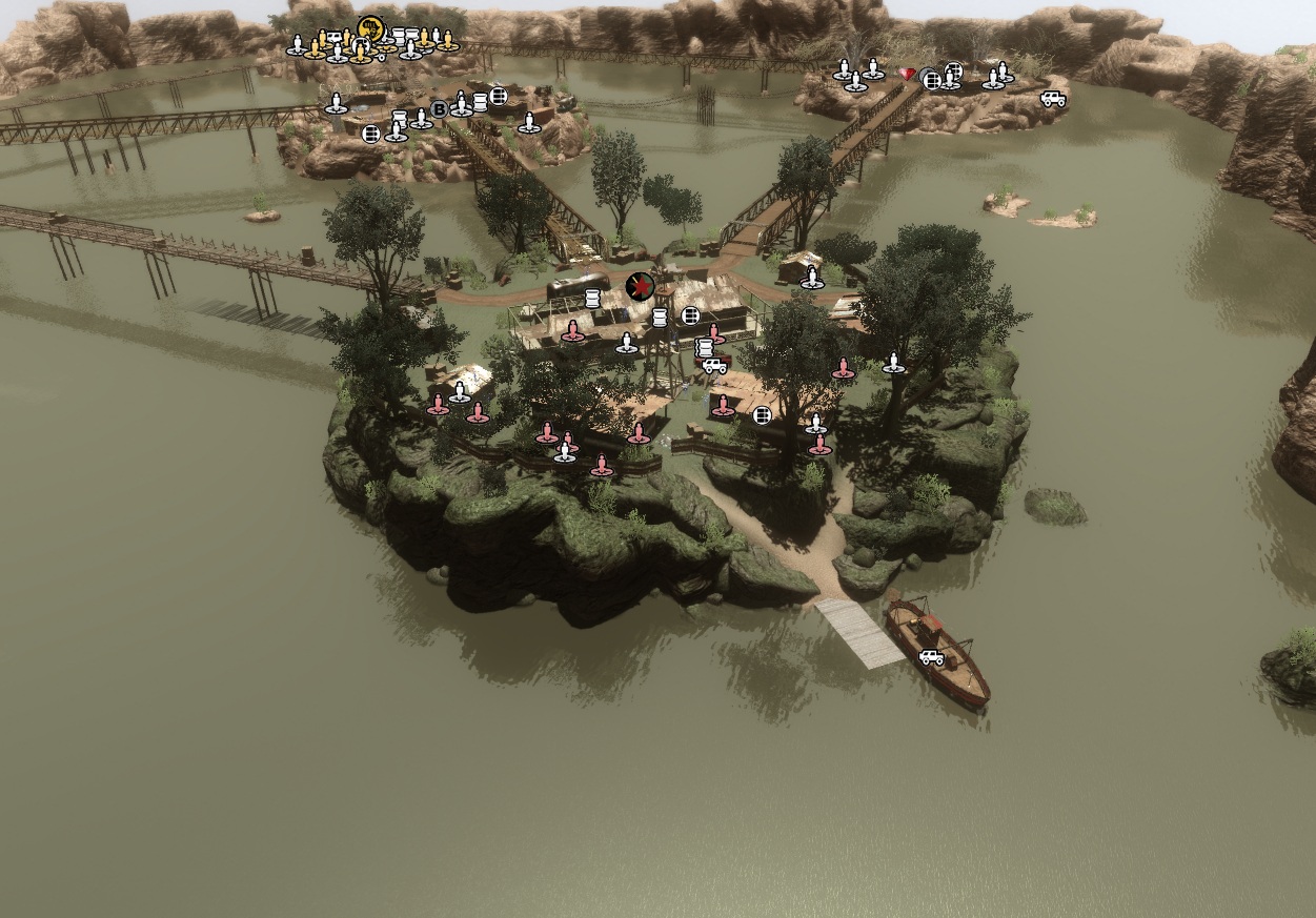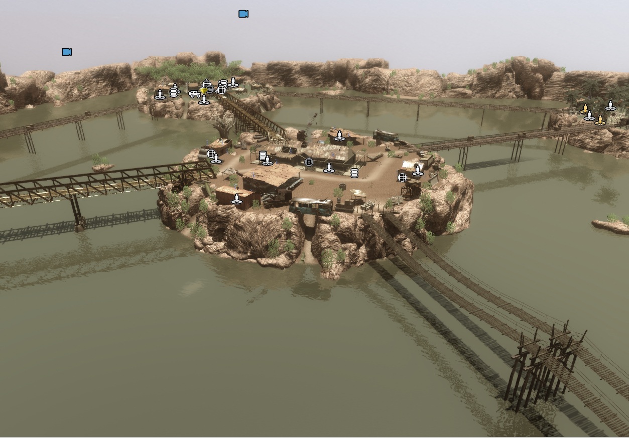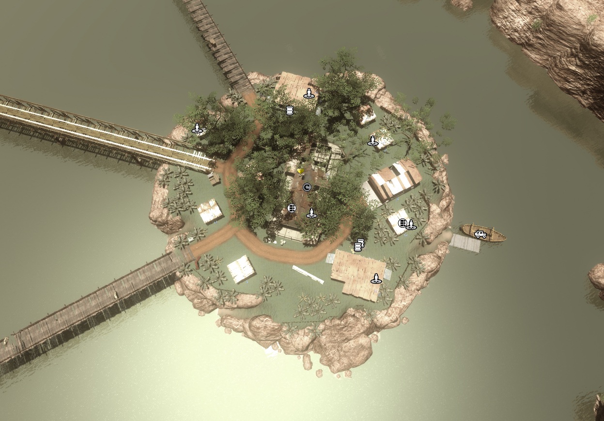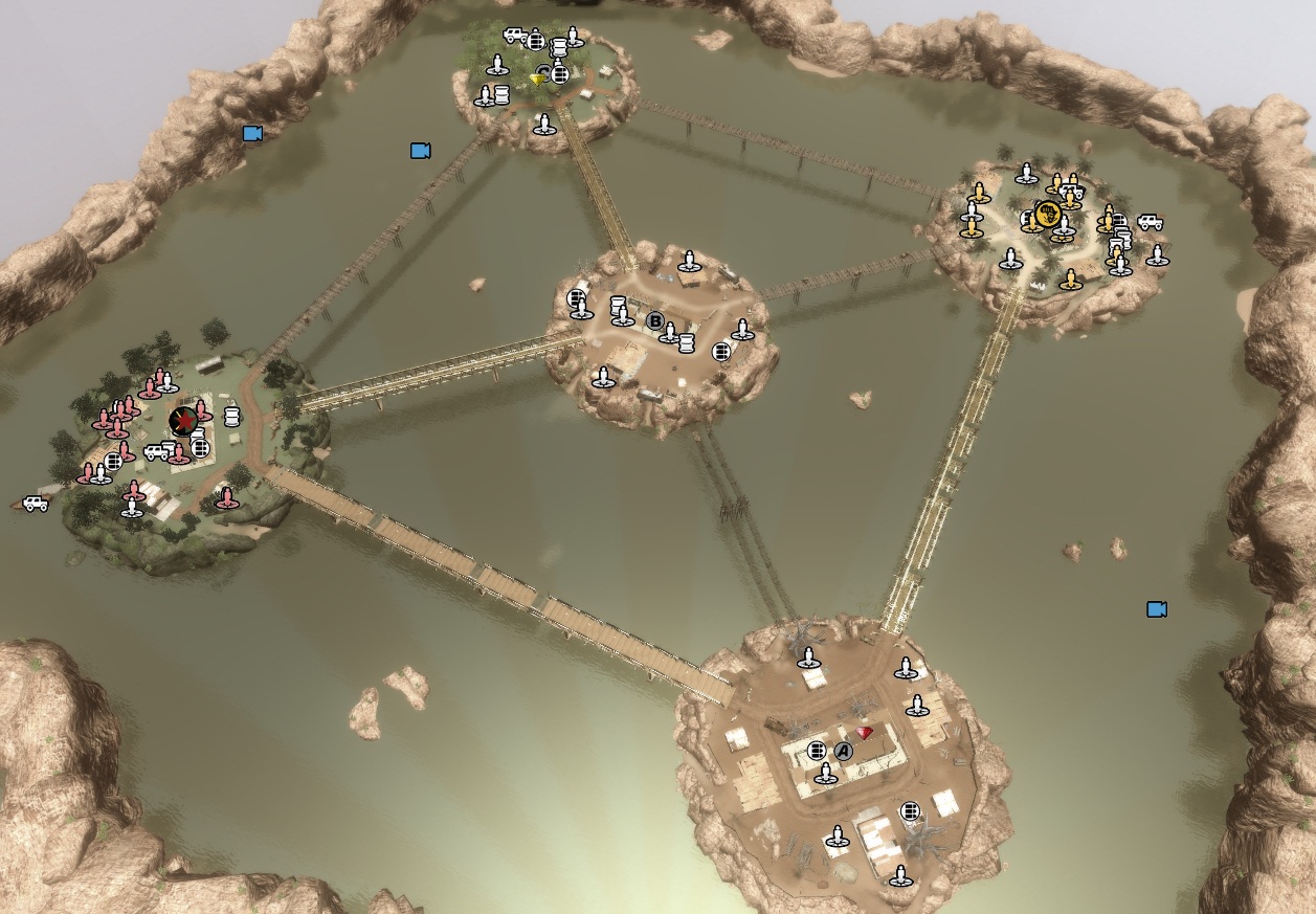 На двух противоположных угловых островах расположены базы команд, на остальных трех островах расположены по точке захвата, так же на двух угловых островах где нет баз команд расположены станции с алмазами (там же по машине, на одном острове с крупнокалиберным пулеметом, на другом с гранатометом).