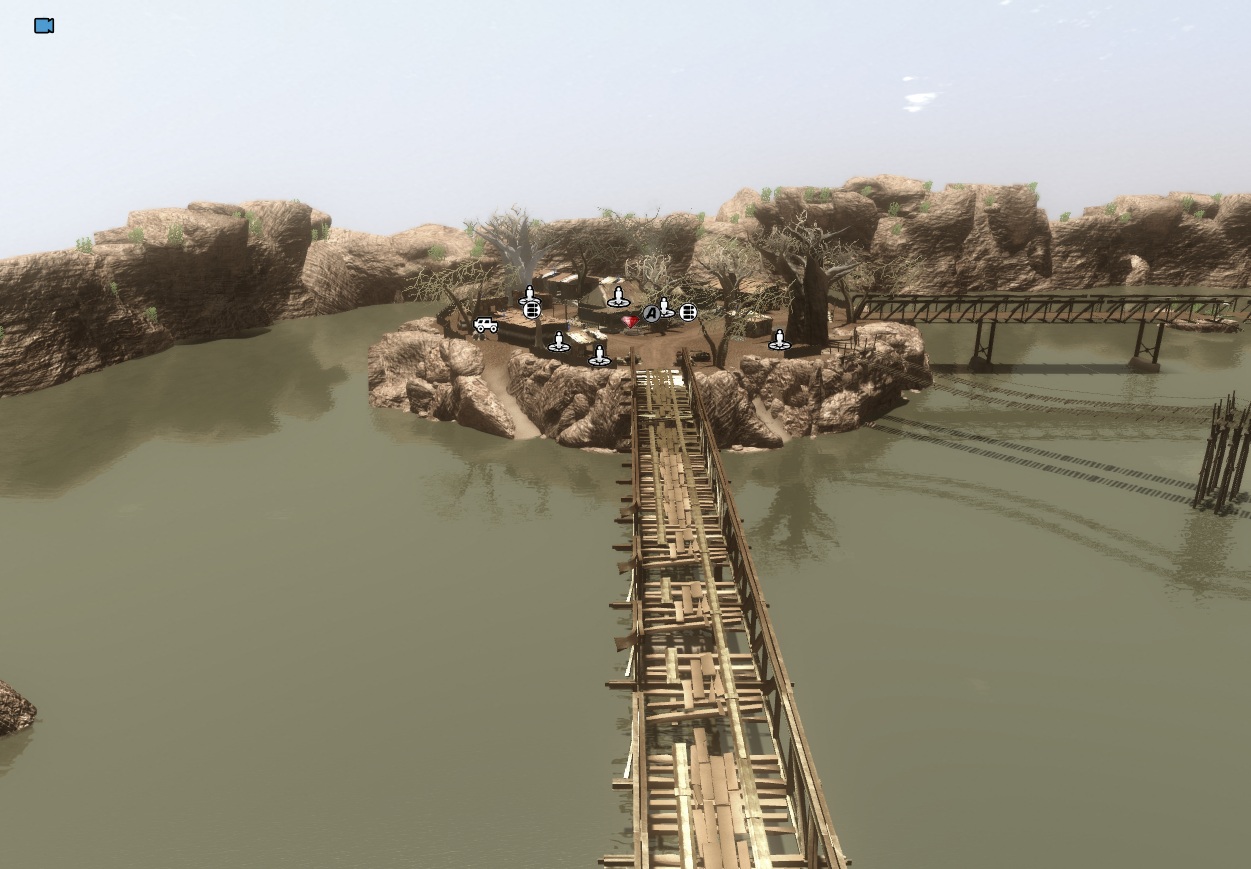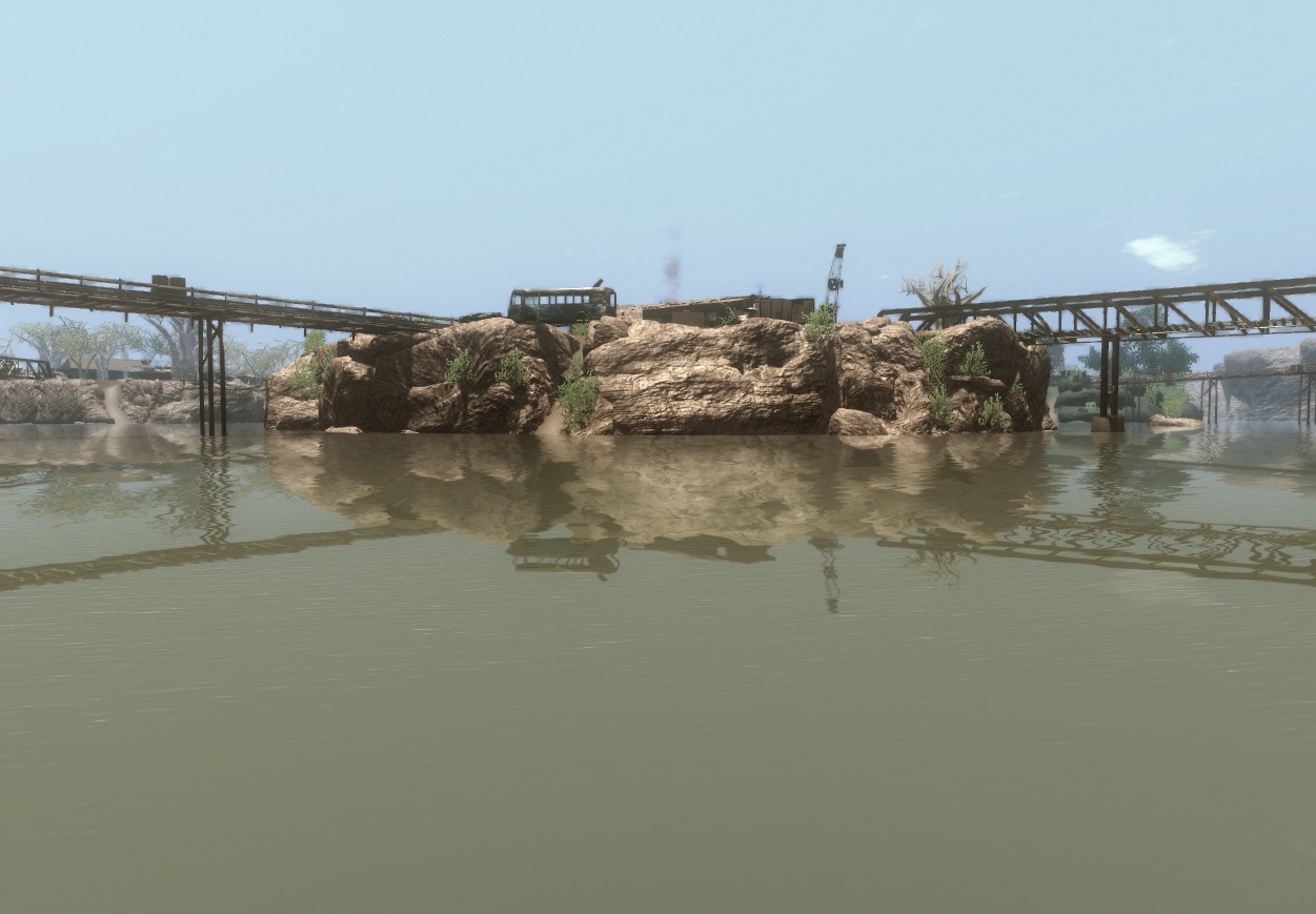 По мостам между островами можно ездить на машине, исключение составляет угловой остров с засохшими деревьями (точка А). Мостик с центрального острова к этой точке чисто пешеходный, два других моста с баз команд слегка разрушены, но по ним можно проехать, нужно лишь давить на газ в пол и прижиматься к нужной стороне моста.