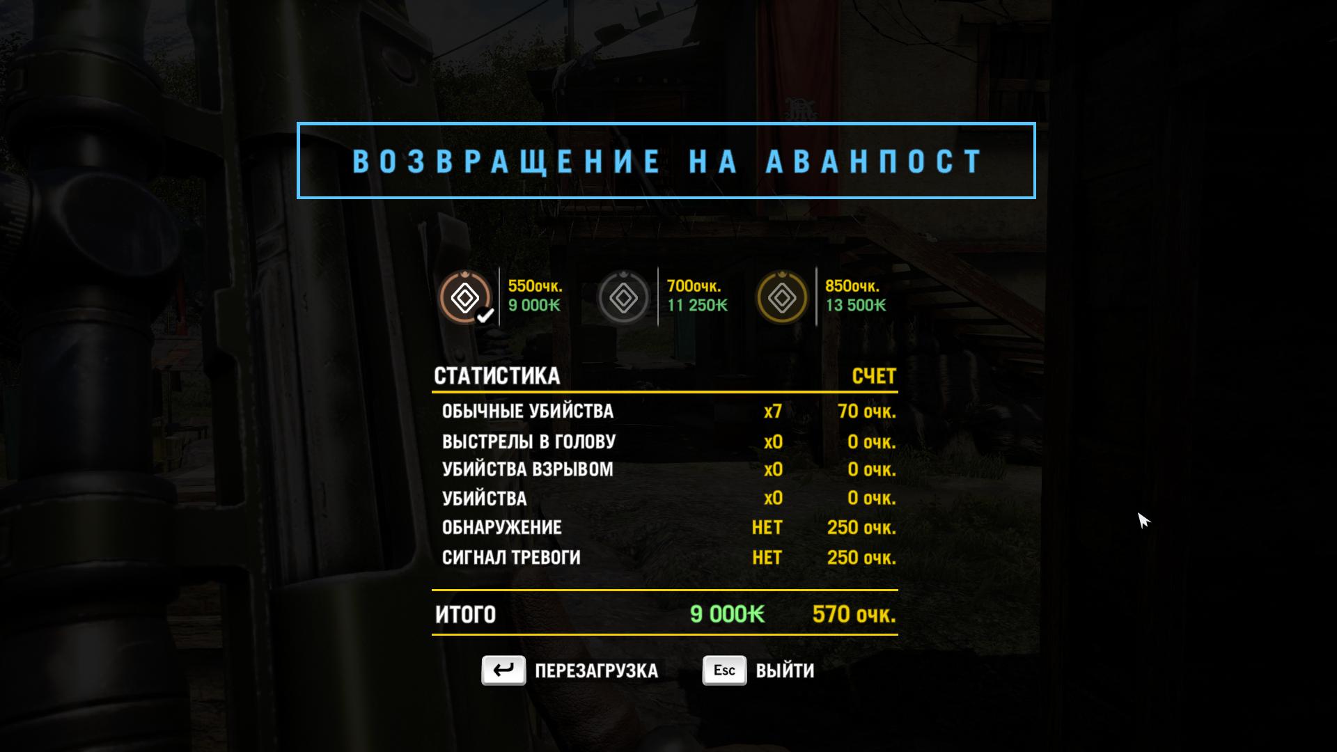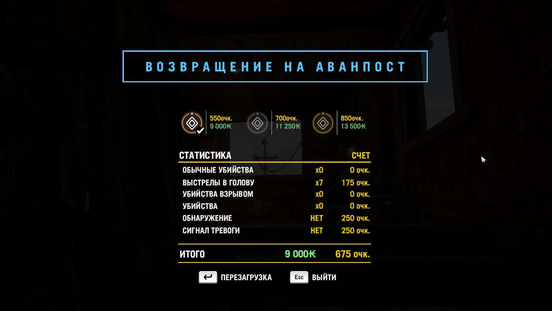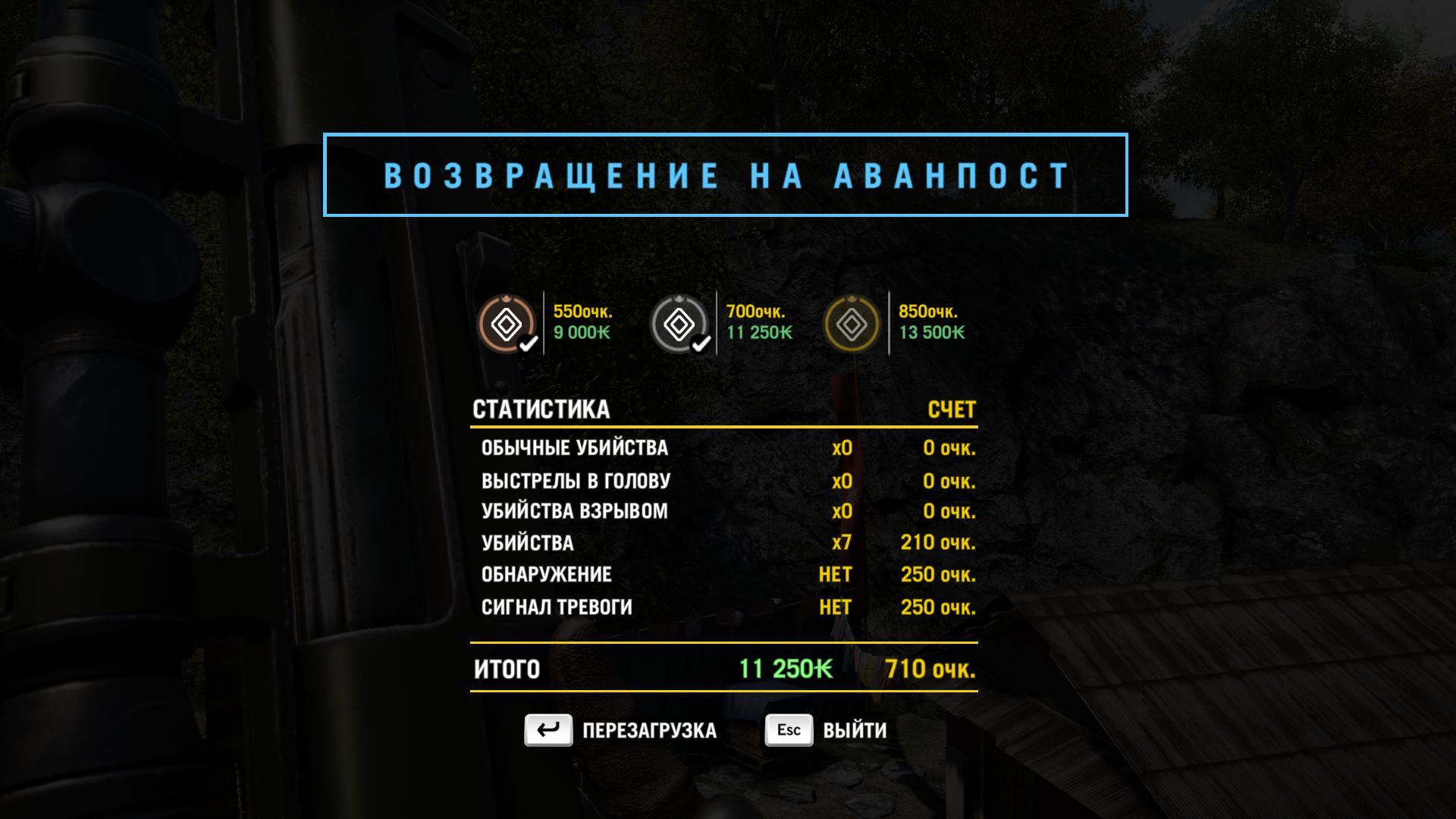 В общем, на 7-ми противниках максимум, что можно заработать, это 710 очков. Как заслужить на "золото" ещё 140, а это примерно 4 с половиной человека))), - х/з. Пробовал мультиубийства: серия быстрых убийств ножом, несколько человек одним взрывом - очков не добавляет. Осталась под вопросом только собака, за которую вообще ничего не дают. Может, её нужно завалить как-то по-особенному?)) Но к ней фиг подкрадёшься по-тихому. Я не смог.