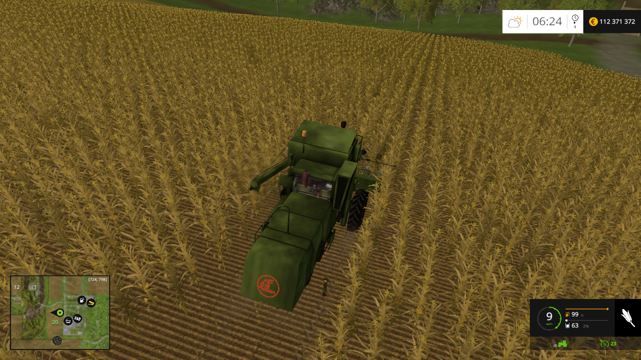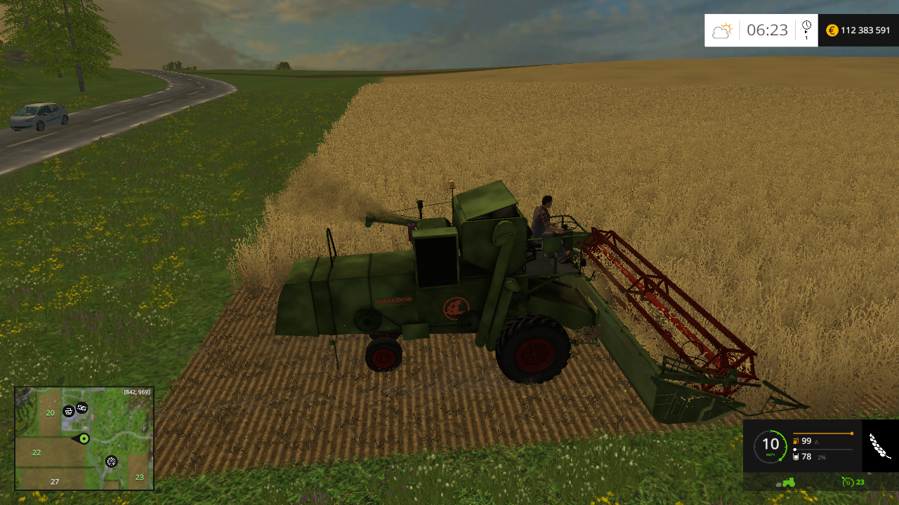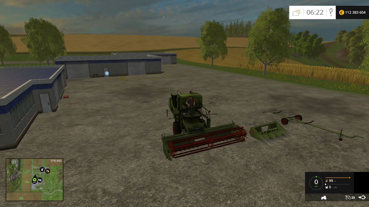 Мощность: 105 л/с , макс. / раб. скорость : 22 / 10 км/ч . Бункер : 2700 л. Открывается боковина, убирается брезент, светотехника, зеркала, следы, пыль, анимация бункера и шнеков. Моется. Жатка для уборки пшеницы, ячменя и рапса. Рабочая ширина — 6 м. Убирается защита, регулировки мотовила, анимация деталей. Моется. Жатка для уборки кукурузы. Рабочая ширина — 3 м. Моется. Транспортная тележка. Пыль, следы. Моется.