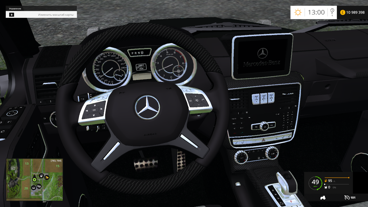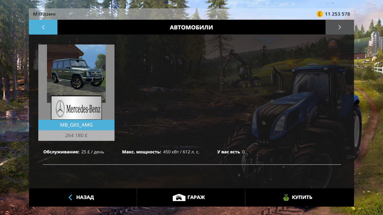 Мощность: 612 л/с , скорость: 100 км/ч. Светотехника ,анимация приборной панели, выбор цвета при покупке, прицепное , оставляет следы ,пыль из под колёс.