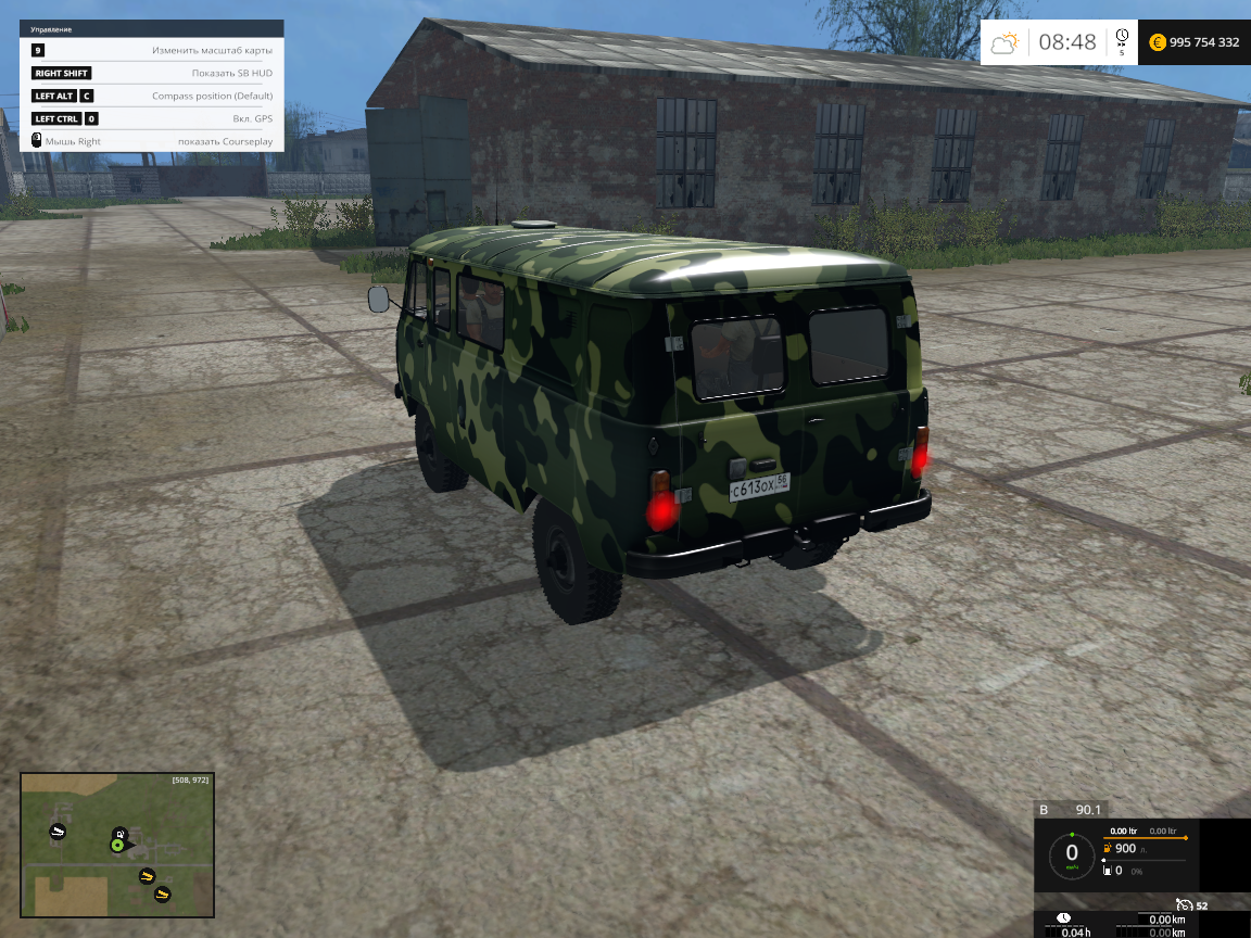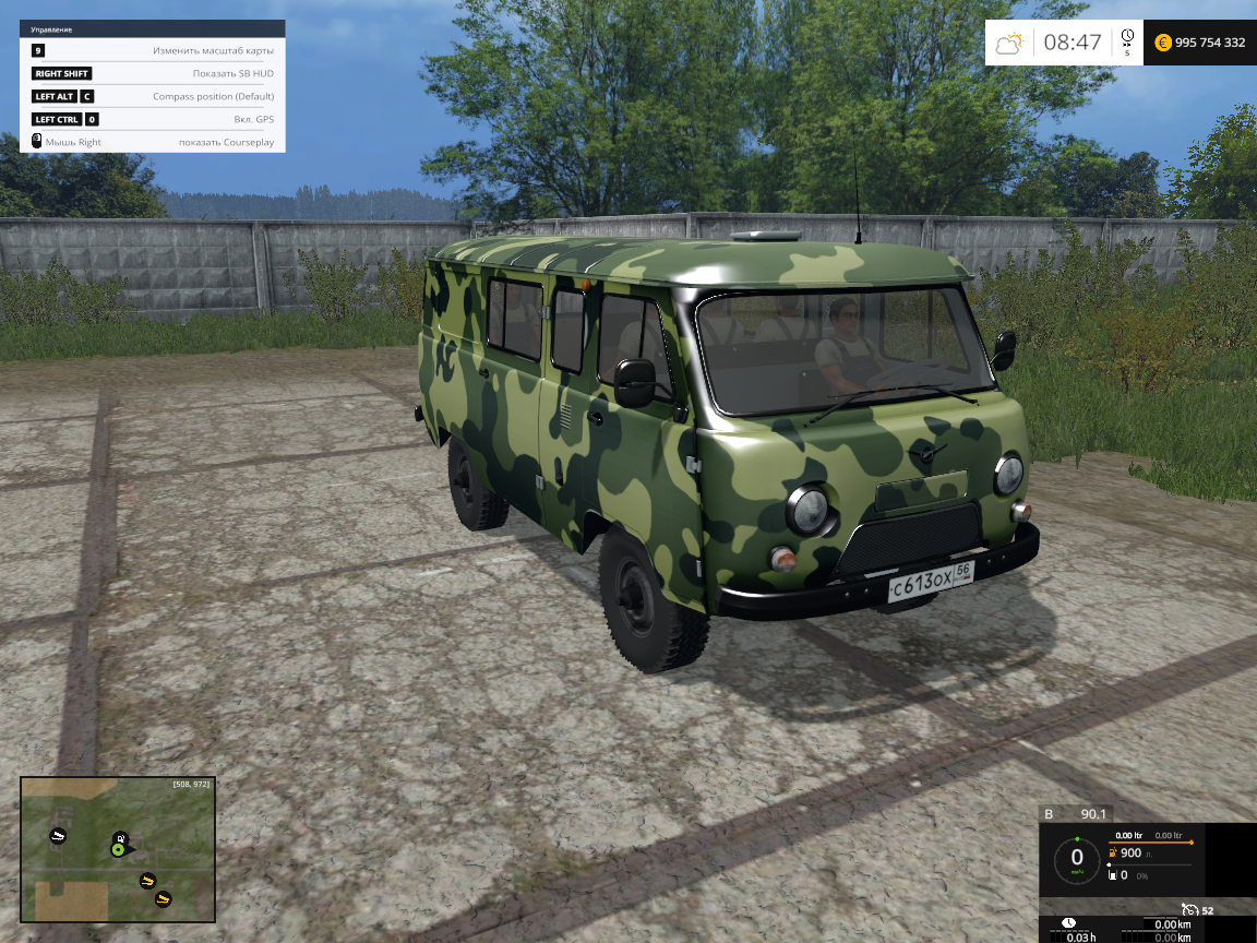 УАЗ 3909 - максимальная скорость 52 км.ч. Дорожные следы и колесная пыль, открываются двери и поднимается капот.