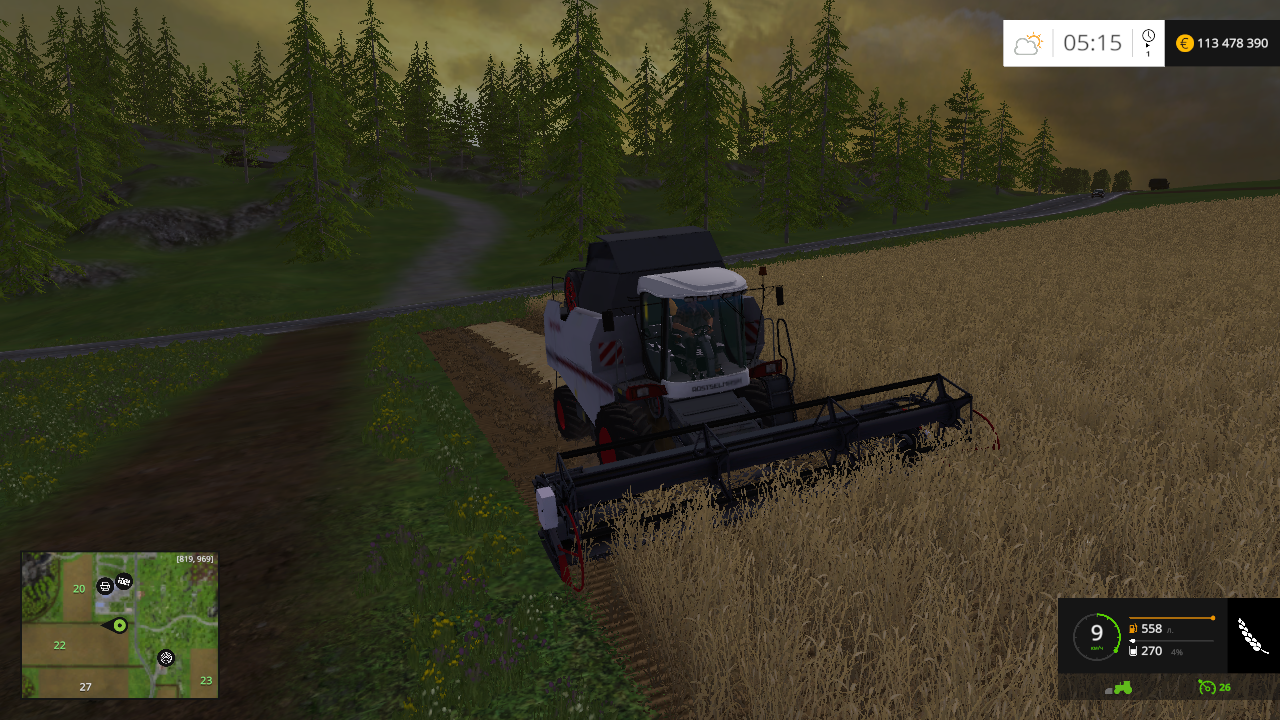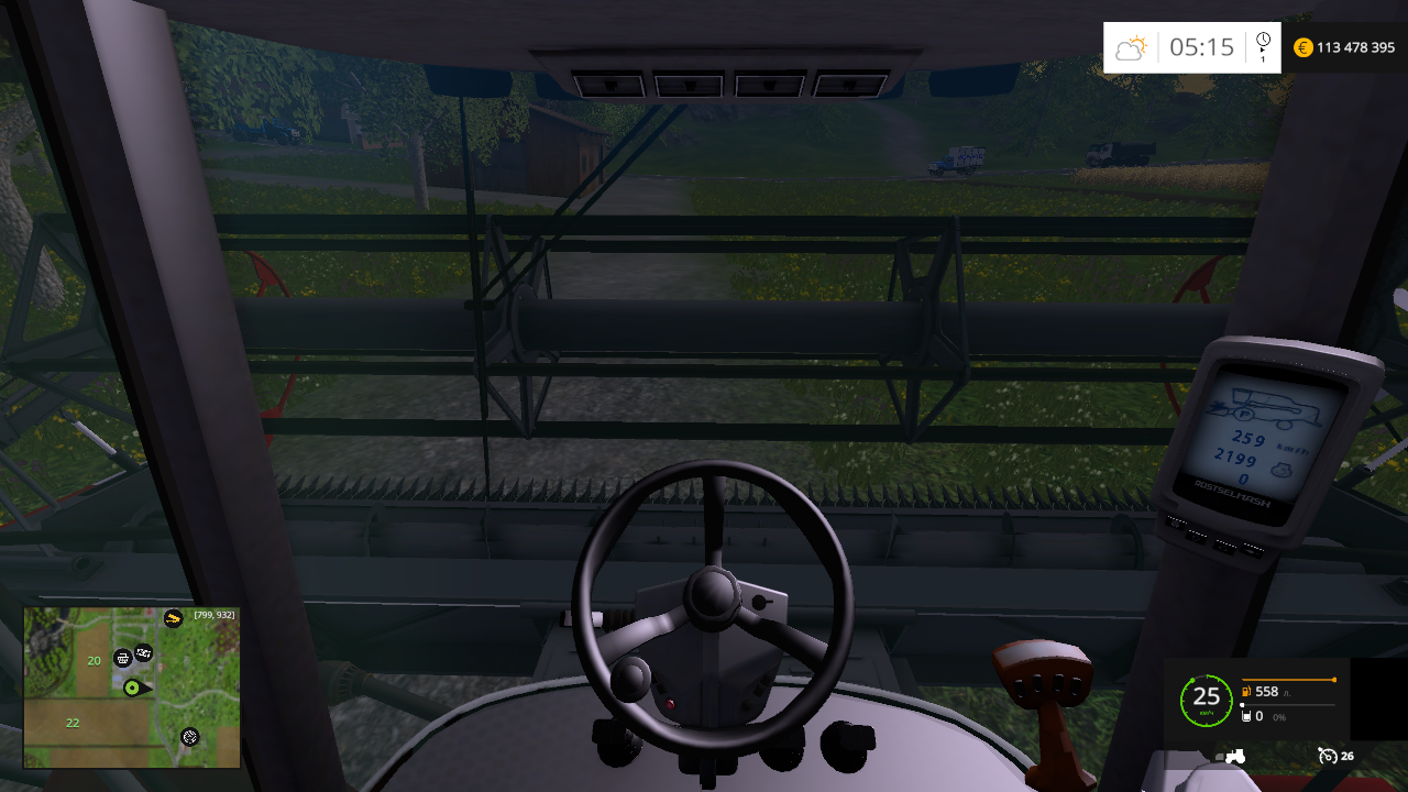 Объем зернового бункера: 6000 литров. Жатка: 6м. Мощность: 210 л.с. Максимальная скорость: 25 км/ч. Культуры: стандартные. Особенности: фары, приборы и зеркала. Анимированные фермер, бункер, измельчитель, ролики, вентиляторы. Новые колеса и многое другое. Схема и данные двигателя были скорректированы. Текстуры оптимизированы. Расход топлива регулируется.