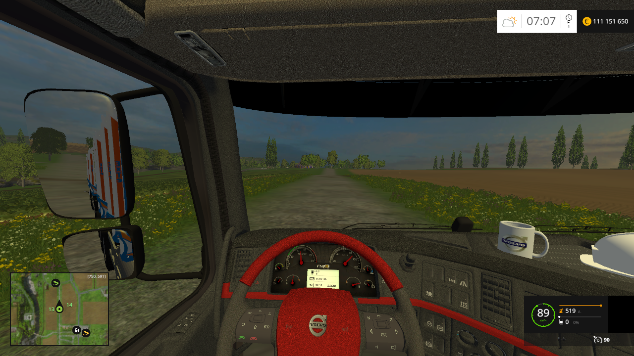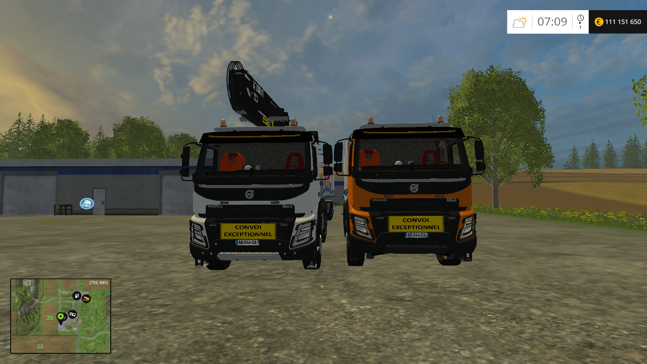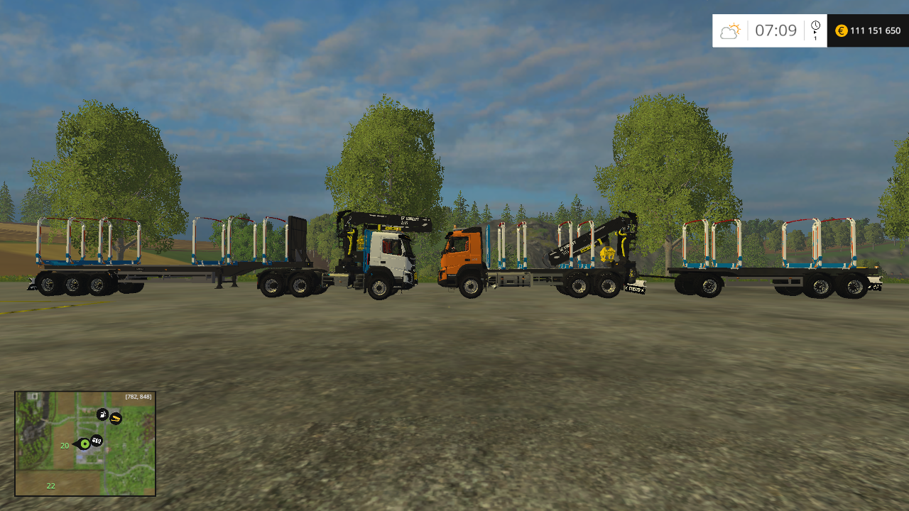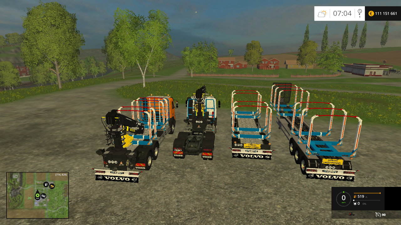 В паке два грузовика , прицеп и полуприцеп (для перевозки брёвен) .Мощность: 550 л/с, скорость: 89 км/ч. Светотехника , спидометр и тахометр , зеркала , оставляет следы .