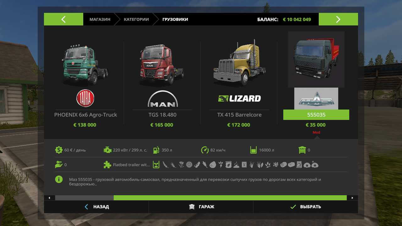 Выбор: мощности двигателя при покупке 235, 300 л/с; основного цвета; 2 типа колёс;цвет дизайна.Скорость: 102 км/ч. Вместимость грузовика и прицепа: 16 000/15 000 л. Светотехника, зеркала, спидометр и тахометр, прицепное ус-во,оставляет следы, пыль из под колёс.
