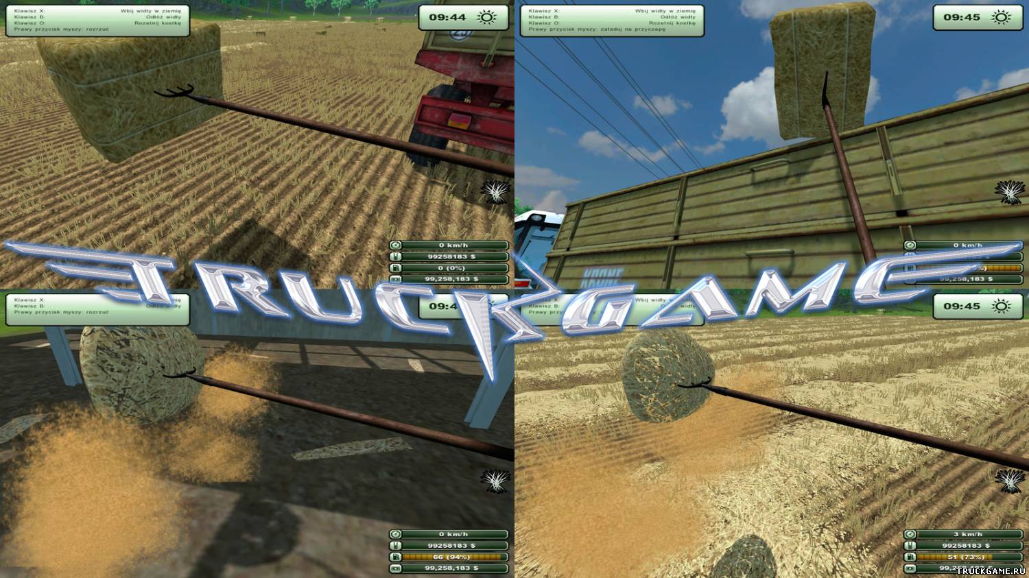 Мод "Вила RU" для Farming / Landwirtschafts Simulator 2013 — Вила служат для подбора скошенной соломы, травы, навоза с кучи, квадратных тюков с земли и погрузки всего этого на прицеп или в триггеры разгрузки. Так-же можно выгрузить солому, траву и тюки в любое место на карте. Присутствует возможность распотрошить тюк, превратив его в солому или траву. Русифицированы подсказки так что думаю рассказывать о клавишах управления без надобности. Тюки грузятся не на все прицепы, используйте прицеп Krone Emsland (так-же этим прицепом можно возить и вила) или любой другой, в который интегрирован StrawMod.