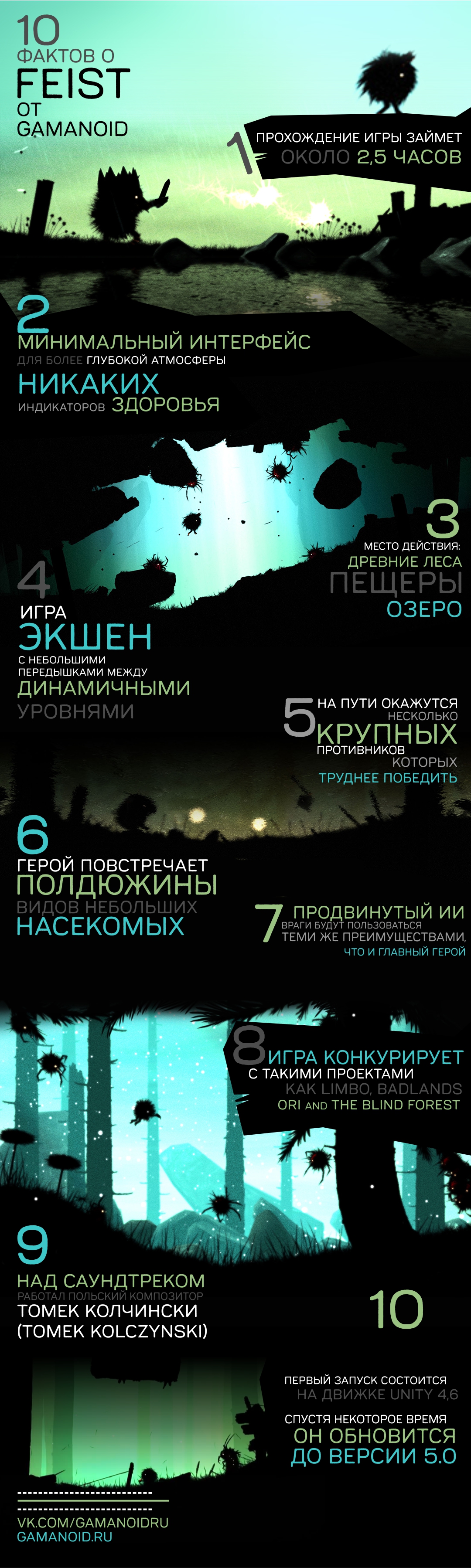 Бытует мнение, что 2D-игры ограничены в своих возможностях, а значит, в целом сильно проигрывают своим объемным конкурентам. Но это не о Feist – инди-проекте, который вернётся из небытия уже послезавтра – 23 июля на платформах PC, Mac, Linux, а также в Steam. Специально для вас, Gamanoid пообщался с Адрианом Штутцом – дизайнером из Bits and Beasts и одним из создателей игры. Итогом беседы стала инфографика по десяти главным фактам Feist.