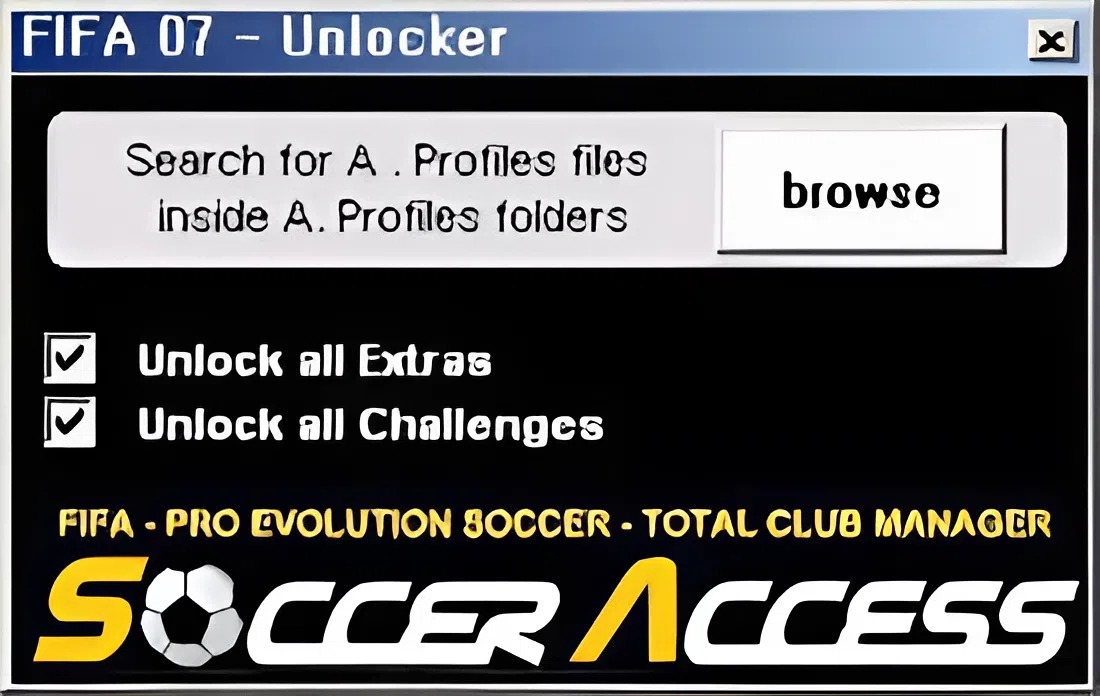 Небольшая утилита‑анклокер, позволяющая добавить очки в профиль FIFA 07 и разблокировать все дополнительные предметы, задания и челленджи — без создания нового профиля. При обработке профиля программа автоматически создаёт резервную копию и добавляет в аккаунт «99 000 000» очков (или другой указанный объём), после чего все внутриигровые награды становятся доступными.