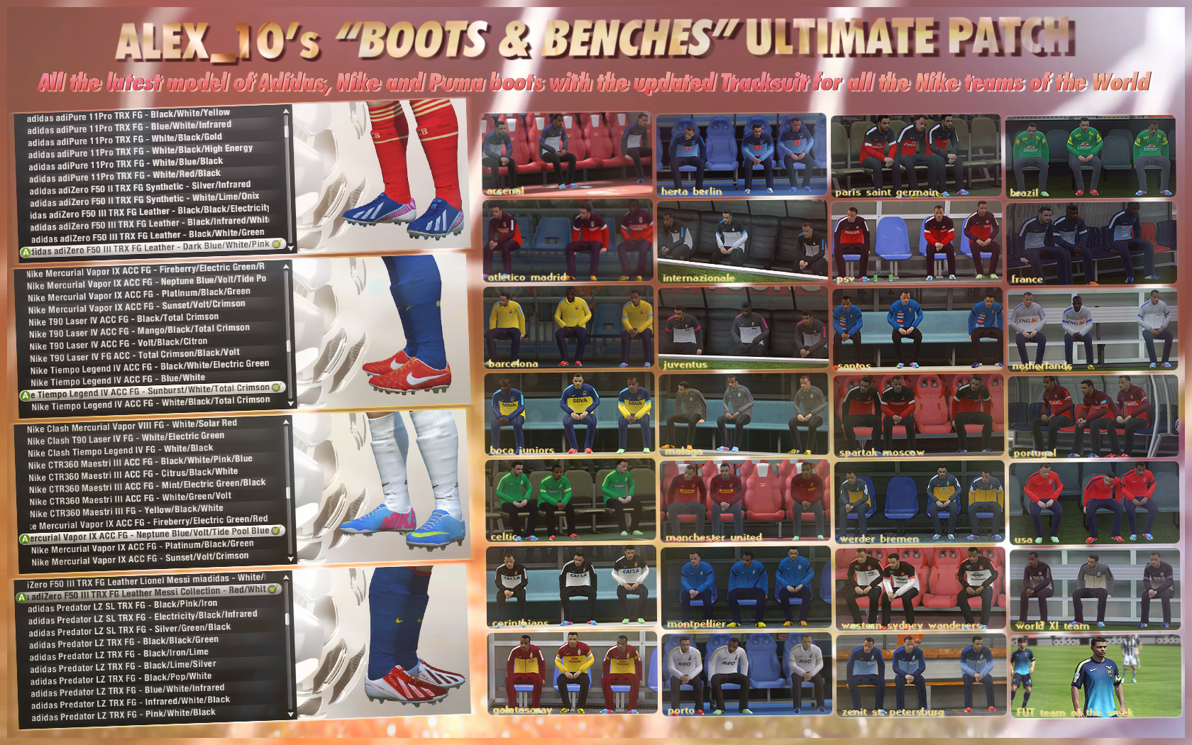 LIST OF THE SHOES: 21 adidas Predator LZ TRX FG- White/Infrared/Black 22 adidas Predator LZ TRX FG - MetallicGold/White/Black 23 adidas adiPower Predator TRX FG - Electricity/Blue/Black 24 adidas Predator LZ TRX FG - David Beckham Version 25 adidas Predator LZ TRX FG - Oscar Version 26 adidas Predator LZ SL TRX FG - Black/Electricity/Infrared 41* adidas World Cup 44* Nike CTR360 Maestri III FG - Black/White/Crimson 45 Nike Mercurial Vapor VIII FG - Mango/Grey/Red 46 Nike Mercurial Vapor VIII FG - Sail White/Soar Blue/Red 47* Nike Mercurial Vapor VIII ACC FG - Retro/Orange/Red 48* Nike CTR360 Maestri III ACC FG - White/Crimson/Black 49* Nike CTR360 Maestri III ACC FG - Volt/Glow Green/Black 50* Nike CTR360 Maestri III ACC FG - Orange/Silver/Black 51* Nike Mercurial Vapor IX ACC FG - Volt/Orange/Black 52* Nike Mercurial Vapor IX ACC FG - Purple/Lime Green/Black 53* Nike Mercurial Vapor IX ACC FG CR7 Collection - White/Volt/Crimson 54 Nike Tiempo Legend IV ACC FG - Black/White/Red 55* Nike Tiempo Legend IV ACC FG - Volt/Green Glow/Black 60* Puma PowerCat One FG - Yellow/Violet/White 61 Puma PowerCat Graphic FG - Blazing Yellow/Medieval Blue/Flame Scarlet 126* adidas Predator LZ TRX FG - Blue/White/Infrared 127* adidas Predator LZ TRX FG - Black/Iron/Lime 128* adidas Predator LZ TRX FG - White/Gold/Black 129* adidas Predator LZ TRX FG - Black/Black/Green 130* adidas Predator LZ TRX FG - Pink/White/Black 131* adidas Predator LZ TRX FG - Black/Pop/White 132* adidas Predator LZ SL TRX FG - Silver/Green/Black 133* adidas Predator LZ SL TRX FG - Black/Pink/Iron 134* adidas adiZero F50 III TRX FG Leather - Infrared/Black/White 135* adidas adiZero F50 III TRX FG Leather - Electricity/Hero Ink/Silver 136* adidas adiZero F50 III TRX FG Leather - White/Dark Blue/Joy Blue 137* adidas adiZero F50 III TRX FG Leather - Black/Infrared/White 138* adidas adiZero F50 III TRX FG Leather - Black/Black/Electricity 139* adidas adiZero F50 III TRX FG Leather - White/White/Infrared 140* adidas adiZero F50 II TRX FG Synthetic - White/Lime/Onix 141* adidas adiZero F50 II TRX FG Synthetic - Silver/Infrared 142* adidas adiZero F50 III TRX FG Leather Lionel Messi miadidas - White/Red/Black 143* adidas adiPure 11Pro TRX FG - Blue/White/Infrared 144* adidas adiPure 11Pro TRX FG - White/Red/Black 145* adidas adiPure 11Pro TRX FG - Black/Infrared/White 146* adidas adiPure 11Pro TRX FG - Black/White/Yellow 147* adidas adiPure 11Pro TRX FG - Black/Black/Gold 148* adidas adiPure 11Pro TRX FG - White/Blue/Black 150* adidas adiPure 11Pro TRX FG - White/Black/High Energy 151* adidas adiPure 11Pro TRX FG - Black/White/Violet 162* Nike Tiempo Legend IV ACC FG - White/Black/Total Crimson 163* Nike Mercurial Vapor IX ACC FG - Platinum/Black/Green 164* Nike CTR360 Maestri III ACC FG - Yellow/Black/White 165* Nike CTR360 Maestri III ACC FG - Black/White/Pink/Blue 167* Nike Tiempo Legend IV ACC FG - Blue/White 168* Nike Mercurial Vapor IX ACC FG - Sunset/Volt/Crimson 169* Nike CTR360 Maestri III ACC FG - White/Green/Volt 173* Puma King - Blue/Yellow (based on the EA Sports Update) 175* Puma PowerCat One FG - White/Orange/Ocean 176* Puma PowerCat 1.12 FG - Black/Green/Blue 177* Puma PowerCat One FG - Black/Ocean/Volt 195* adidas adiZero F50 III TRX FG Leather - Electricity/Electricity/Electricity 198* adidas adiZero F50 III TRX FG Leather Messi Collection - Red/White 199* adidas adiZero F50 III TRX FG Leather - Black/White/Green 200* adidas adiZero F50 III TRX FG Leather - Dark Blue/White/Pink 201* adidas adiZero F50 III TRX FG Leather - Yellow/Black/Green 202* adidas adiZero F50 III TRX FG Leather - Green/Dark Blue/Joy Blue 203* adidas adiZero F50 III TRX FG Leather - Silver/Black/Joy Blue 204* adidas Predator LZ TRX FG - White/Yellow/Blue 205* adidas Predator LZ TRX FG - Black/Lime/Silver 206* adidas Predator LZ TRX FG - Yellow/White/Pink 207* adidas Predator LZ TRX FG - Infrared/White/Black 208* adidas Predator LZ SL TRX FG - Electricity/Black/Infrared 209* adidas adiPure 11Pro TRX FG - White/Black/Gold 210* adidas adiPure 11Pro TRX FG - Black/Hi Res Orange/White 211* adidas adiPure 11Pro TRX FG - Black/Green/White 212* Umbro Speciali 4 FG - White/Black/Silver (based on the EA Sports Update) 213* Umbro Speciali 4 FG - Black/White/Bronze (based on the EA Sports Update) 214* Umbro Geometra 2 FG - Sulphur/Navy/White (based on the EA Sports Update) 215* Umbro Geometra 2 FG - Black/Bluebird/Dark Shadow (based on the EA Sports Update) 216* Umbro GT II Pro-A FG - Orange/Black/Green (based on the EA Sports Update) 217* Umbro GT II Pro-A FG - Yellow/Black/Blue (based on the EA Sports Update) 220* Mizuno Morelia Neo FG - Yellow/Blue (based on the EA Sports Update) 221* Nike CTR360 Maestri III ACC FG - Citrus/Black/White 222* Nike T90 Laser IV ACC FG - Volt/Black/Citron (based on the EA Sports Update) 223* Nike Tiempo Legend IV ACC FG - Black/White/Electric Green 224* Nike Mercurial Vapor IX ACC FG - Fireberry/Electric Green/Red Plum 225* Nike CTR360 Maestri III ACC FG - Mint/Electric Green/Black 226* Nike T90 Laser IV ACC FG - Mango/Black/Crimson (based on the EA Sports Update) 227* Nike Tiempo Legend IV ACC FG - Sunburst/White/Crimson 228* Nike Mercurial Vapor IX ACC FG - Neptune Blue/Volt/Tide Pool Blue 229* Nike Clash CTR360 Maestri II FG - White/Blue 230* Nike Clash Mercurial Vapor VIII FG - White/Solar Red 231* Nike Clash T90 Laser IV FG - White/Electric Green 232* Nike Clash Tiempo Legend IV FG - White/Black (* Boot Available in the Edit Mode) LIST OF THE BENCHPLAYERS: 1 Arsenal 11 Man Utd 38 Werder Bremen 44 Internazionale 45 Juventus 70 Montpellier 73 PSG 78 Celtic 166 Hertha BSC Berlin 236 Porto 240 Atletico Madrid 241 Barcelona 247 PSV 325 Galatasaray 573 Malaga 1041 Corinthians 1053 Santos 1335 France 1354 Portugal 1370 Brasil 1387 USA 1877 Boca Juniors 100767 Spartak Mosca 100769 Zenit 105035 Netherlands 112427 Western Sydney Wanderers FC