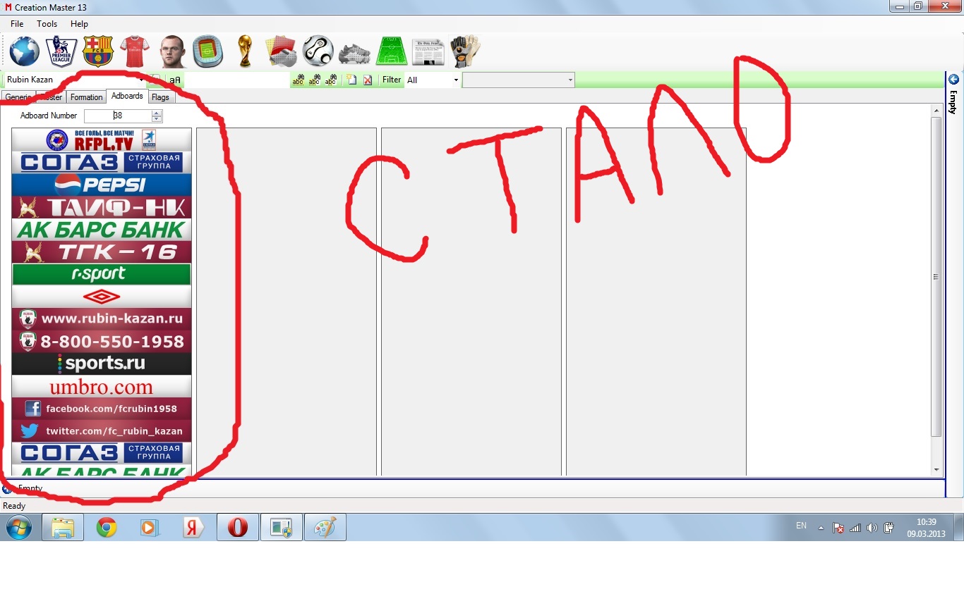 Вобщем надумал я установить рекламные борты, зашел в CM13, выбрал команду Рубин, жмакнул вкладку "Adboards" и загрузил картинку с новыми бордами вместо старых. Но зайдя в игру, я заметил что новые борды появились на всех стадионах ЧР, а мне нужно что бы они были только на домашнем стадионе Рубина. Что я сделал не так? Помогите разобраться пожалуйста.
