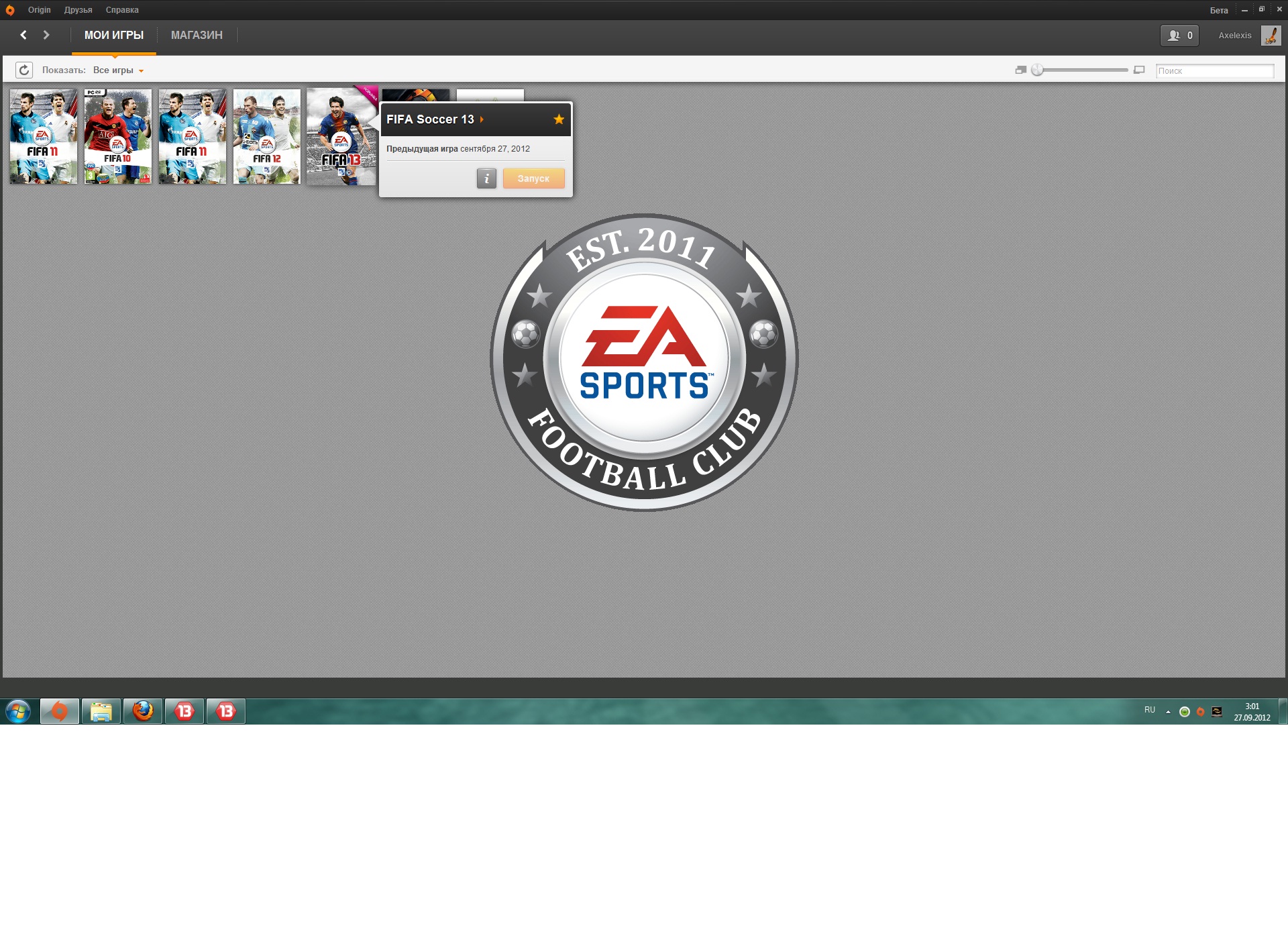 Вчера стала доступна для загрузки игра FIFA 13 через официальный клиент Origin (для PC) для тех, кто делал предварительный заказ, и через консоли (PS3 и Xbox 360), если был приобретен "Season Ticket" через приложение EA Sports Central.