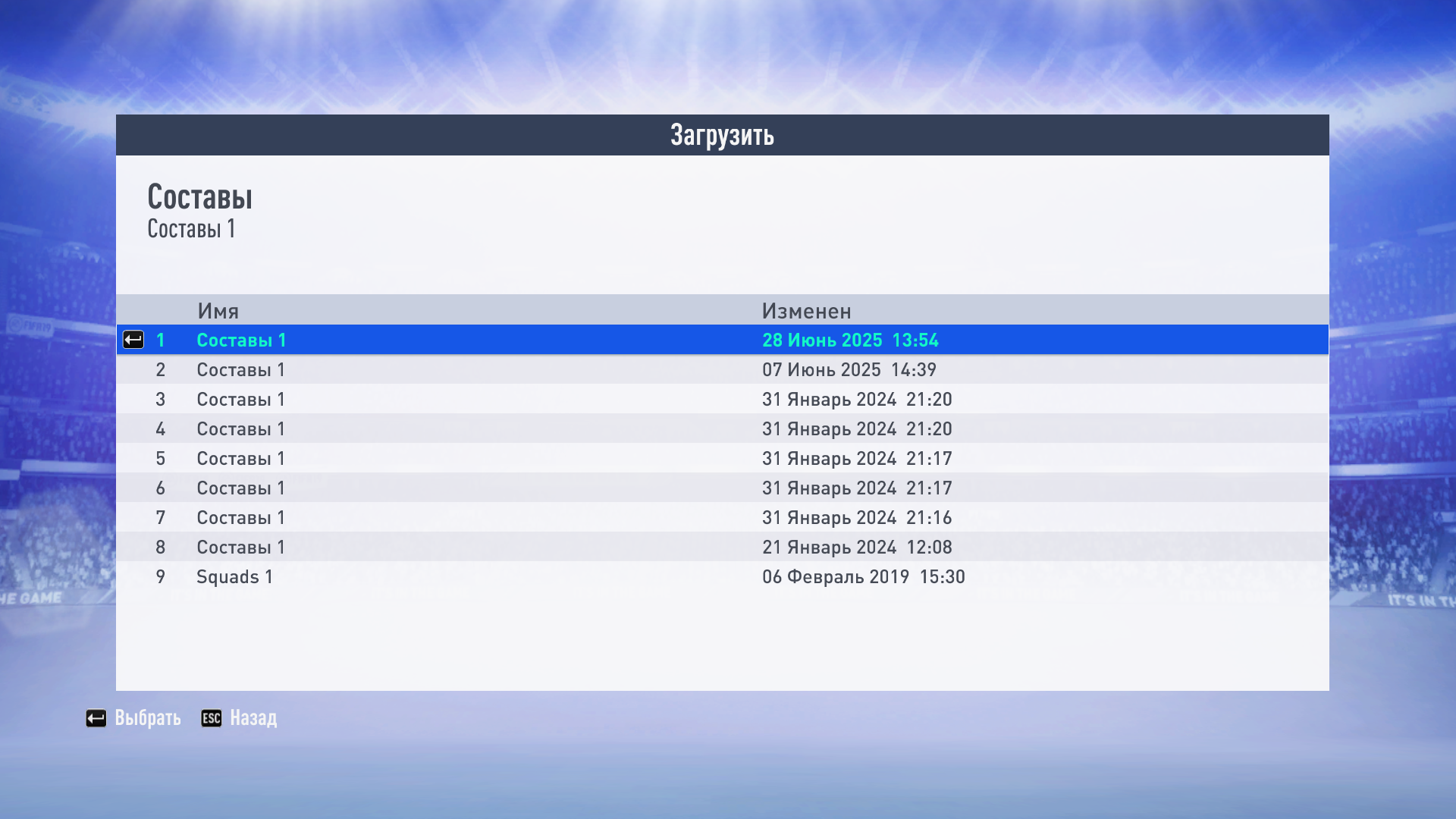 Users\Имя\Documents\FIFA 19\settings. Затем в самой игре: Персонализация - Профиль - Загрузить составы - Составы 1.