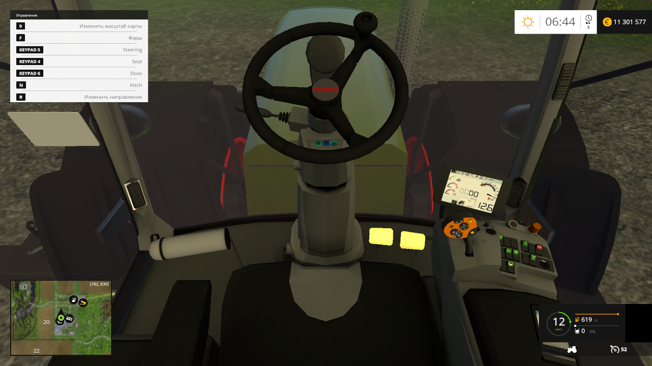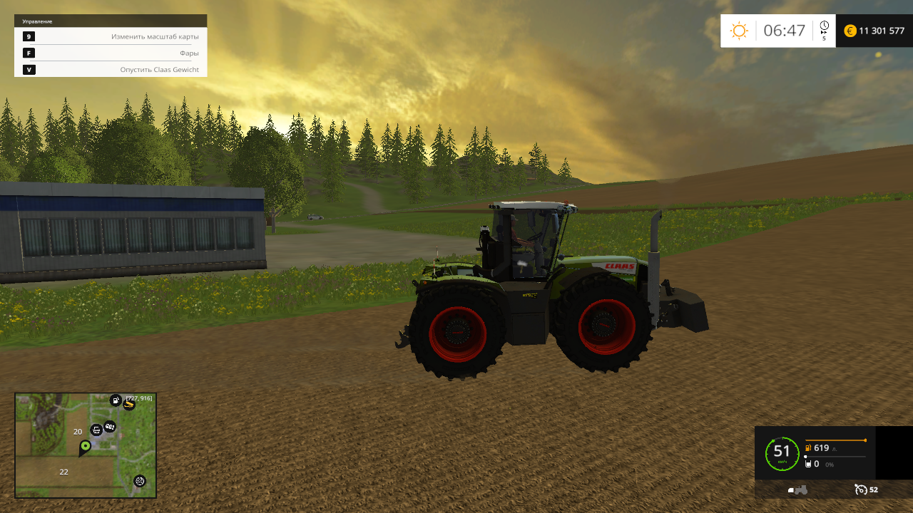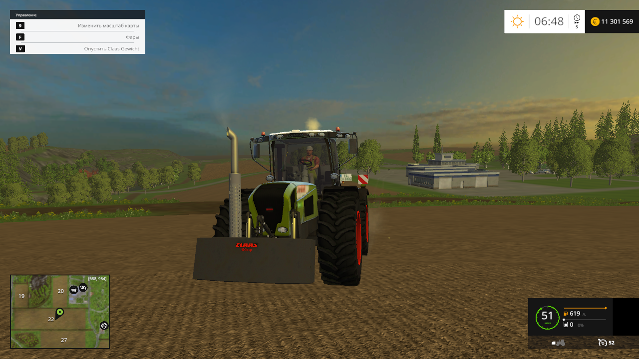 Мощность: 380 л/с , скорость: 52(35) км/ч. Открывается левая дверь, светотехника, эл. спидометр и тахометр, топливо, моточасы, оборотное управление, поворотный мост, убираемое прицепное, покупаемые противовесы ( 1.5\3.0 т , прицепное) ,колёсная пыль ,дорожные следы, анимация руля и спинки.