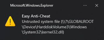 Кто-нибудь знает, как пофиксить проблему с Easy Anti-Cheat. Не пропускает системный файл kernel32.dll в system32. SFC пишет, что есть повреждения, но пофиксить не может. DISM пишет, что повреждений нет. Не пробовал только с заменой, но как я понимаю, просто так этот dll не перекинуть