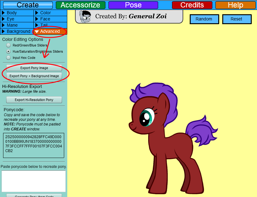 Чтобы сохранить картинку, жмите Advanced - Export Pony Image