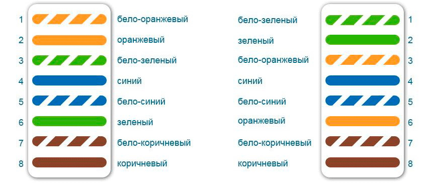 Если вдруг кто позабыл иль ещё чего привожу схему обжимки машина-машина (или нуль-хаб, как его ещё называют):