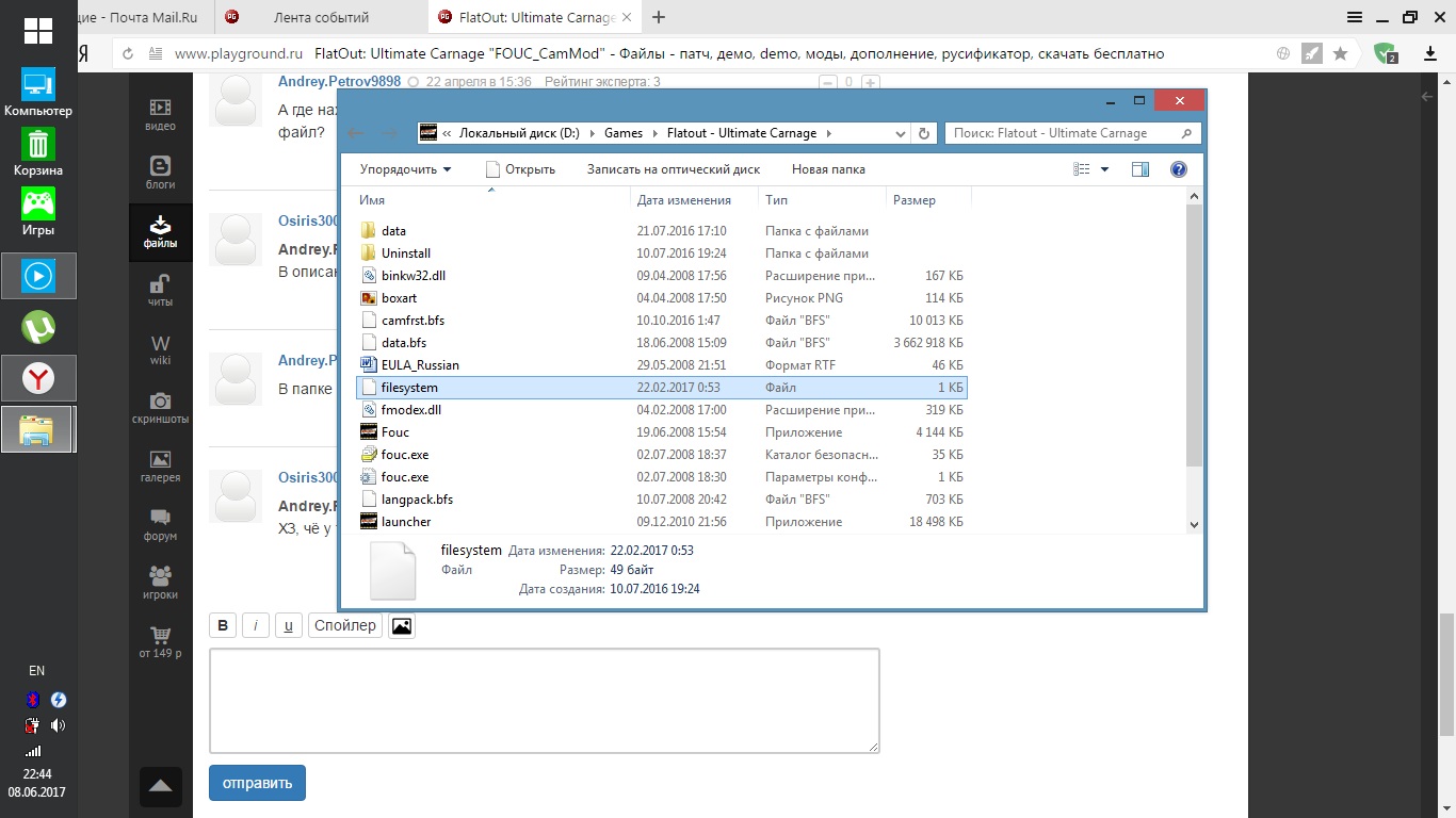 2) Открыть файл "filesystem", также находящийся в папке с игрой, с помощью Блокнота или Wordpad и добавить строчку с названием файла (camfrst.bfs )