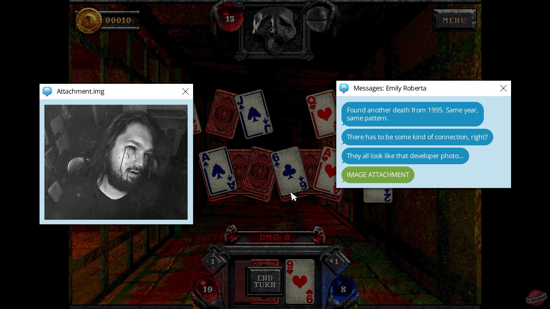 Карточная игра с хоррор-элементами. История построена вокруг мета-идеи: в 2019 году главный герой покупает в секонд-хенде загадочный CD-ROM 1995 года с игрой, которую смутно помнит по рекламе и какому-то скандалу вокруг неё. После запуска наш герой попадает в стилизованный под FMV 90-х цифровой мир подземелий и коридоров. Визуальный стиль имитирует те самые сжатые видеоролики середины 90-х с характерной 256-цветной палитрой и артефактами сжатия, как в катсценах Command & Conquer или подобных игр того времени.