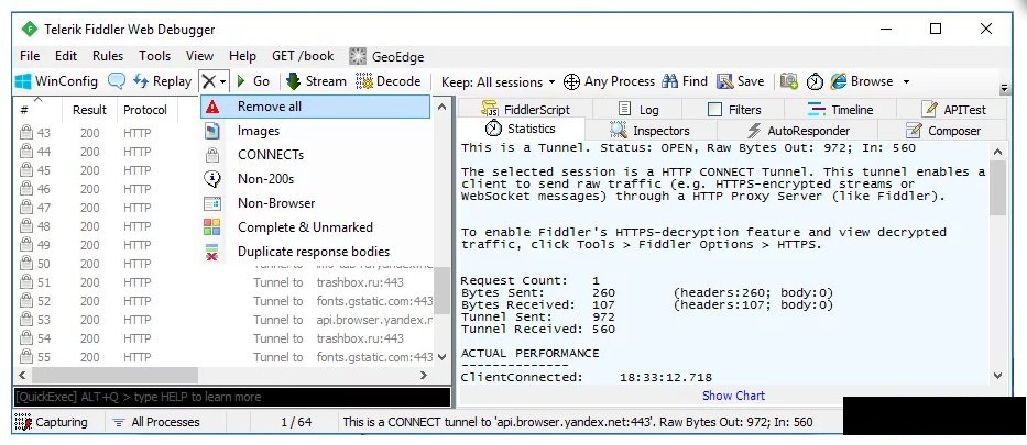 После закрытия окна, нажмите на кнопку с крестиком и выберите строчку "Remove All". Это позволит очистить программу от всех предыдущих перехваченных запросов.