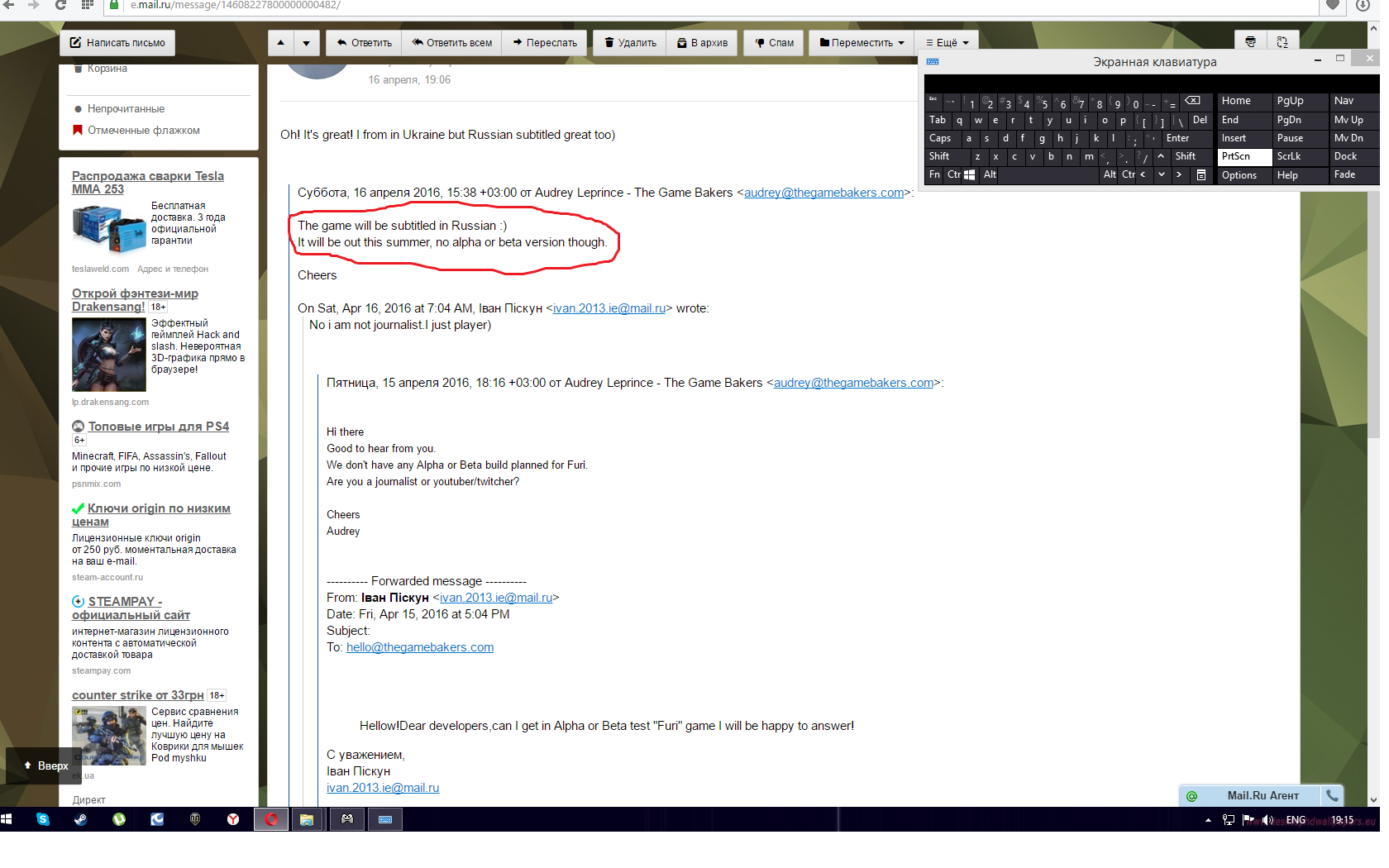 Недавно я переписывался с разработчиками игры Furi. хотел узнать есть ли альфа тест и могу ли я попасть на него...