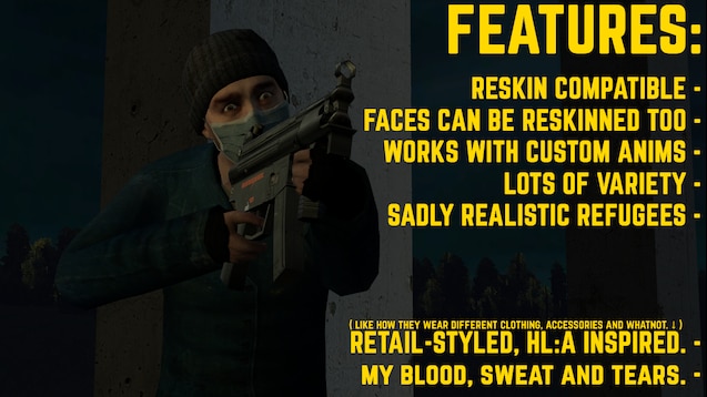 Никогда не задумывались почему беженцы, люди которые прячутся от любой опасности как например хедкраб или случайно запущенный не туда манхэк, ходят себе спокойно без масок? Никакой маскировки, никакой анонимности, всем известно твоё лицо и все могут тебя сдать! С данным модом беженцы теперь носят очки, маски, головные уборы и прочее!