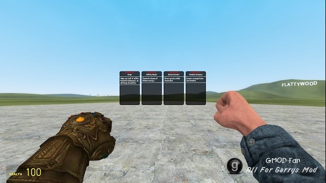 Вы также можете заспавнить модель Перчатки Бесконечности с помощью этой команды: gm_spawn models/xyz/props/infinity_gauntlet.mdl