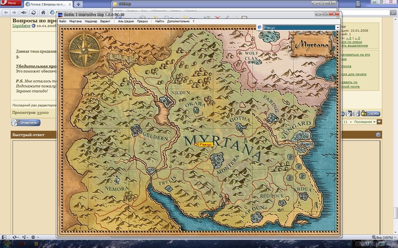 Что бы вы понимали эта та самая Карта 3 Готики где мы могли быть за кого угодно ! Как за орков,наёмников,Короля и т.д и т.п появилась репутация как между фракциями так и между поселениями,что бы пройти какое то из заданий связанных с фракцией надо было заручиться поддержкой поселения,подкуп и запугивание не работало это вам не ГТА и не Мафия. Да и Материк был разделён на 3 Части:Нордмар,Варант и Миртана. Везде были свои лидеры,главы поселения. Кстати Ксардас продался оркам и слил вас Бериару. Тут мы подошли к войне между Богами всё зависело за какую фракцию вы играли и какому богу подчинялись,хотя можно было быть наёмником и служить как белиару так и Аданасу в этой игре ограничений не было,свобода действий и да о самом главном ! Почему Готика так нравилась олдскульным игрокам ? ответ прост там не было карты как в современных играх,там не было руки разработчиков которая вела вас к нужной точке и разжёвывала вам что делать и что говорить,с кем быть другом а с кем врагом. Вы были и богом и чёртом в одном лице,вы творили и разрушали мир так как считали нужным ! в 3 части появился компас но по сути он не показывал куда идти лишь примерно а вы должны были угадать и естественно надо было покупать Карты что бы дойти и движок изменён был это была новая версия Genome Engine