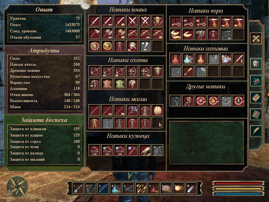 Gothic III : 83 уровень, 352 силы, 248 охотничьи навыки, 345 древнее знание, 60 кузнечное дело, 61 воровские умения, 142 алхимия, 500 жизни, 256 выносливости, 750 маны - (паладин)