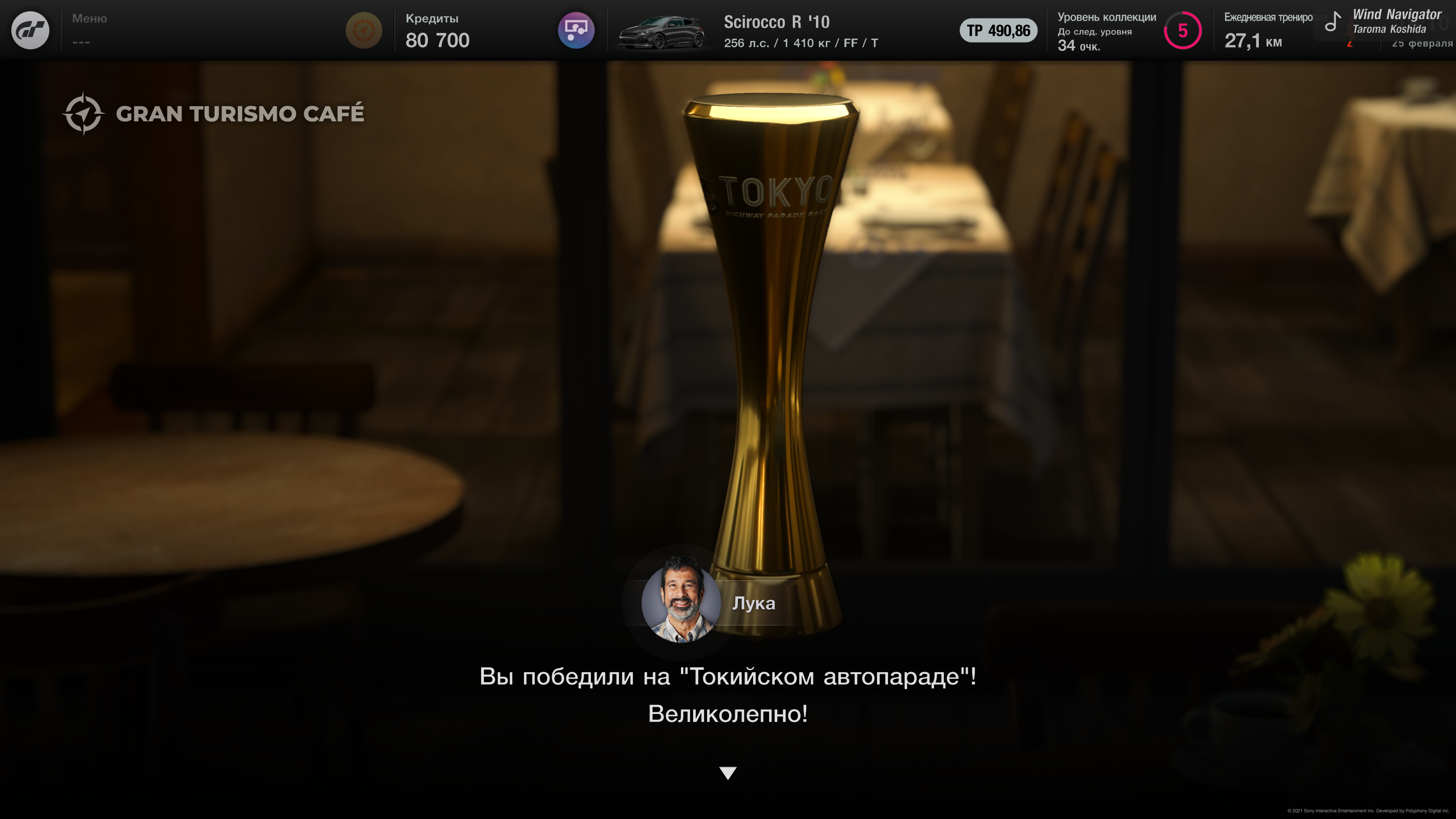 Есть, кхем, внутриигровое кафе, владелец которого готовит гоночное меню. Я вот это пишу уже после того, как наиграл достаточно часов, и все еще пощипывая себя. Есть ощущение, что происходящее в игре похоже на сюр, но я это опишу. Гоночное меню - это такой чек-лист из трех автомобилей, которые вы должны купить или выиграть в заезде, заняв место не ниже третьего. Потом вы возвращаетесь в кафе и достопочтенный Лука толкает вам телегу про эти три машины. История, как правило, подобна средней заметки из любого журнала об авто. Навроде того, как вам в сотый раз объясняют что такое хот-хэтчи. Ну, это маленькое, переднеприводное и заряженное. Спасибо, Gran Turismo, мы и не знали к этому времени таких вещей.