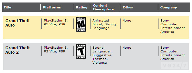 Первая и вторая часть GTA получили возрастной рейтинг от ERSB. Игры должны появиться на PS3 и PS Vita.