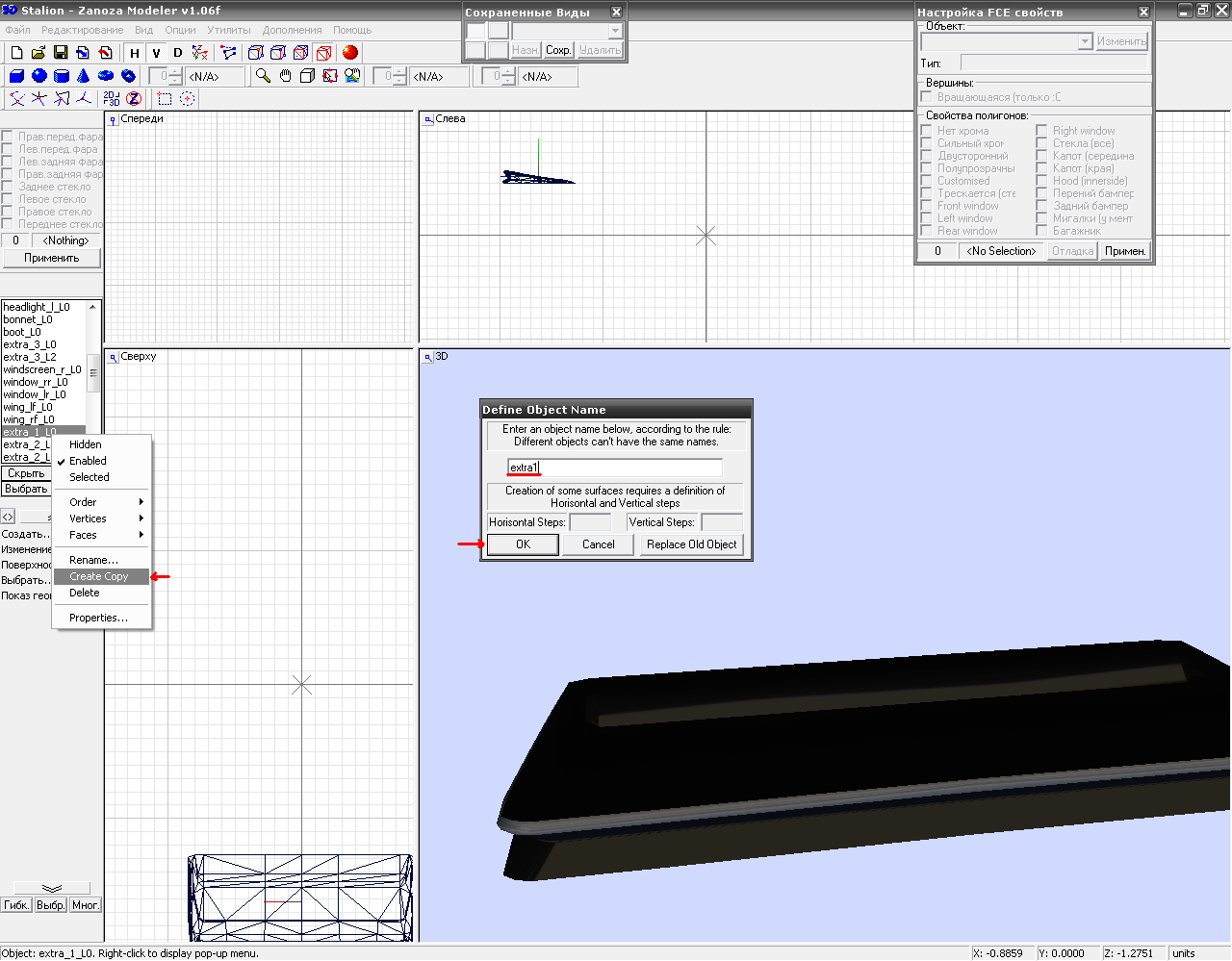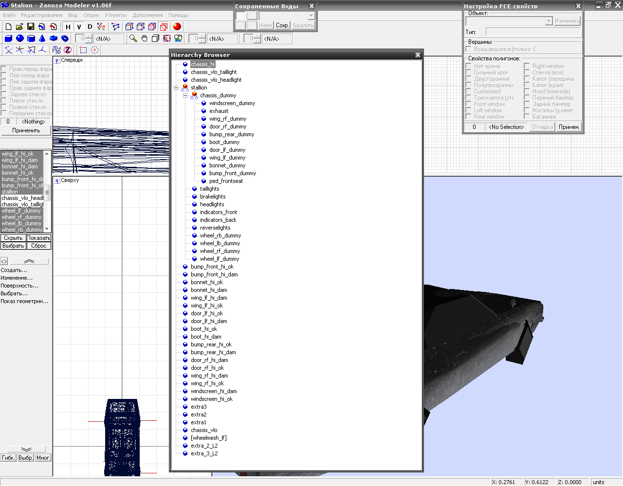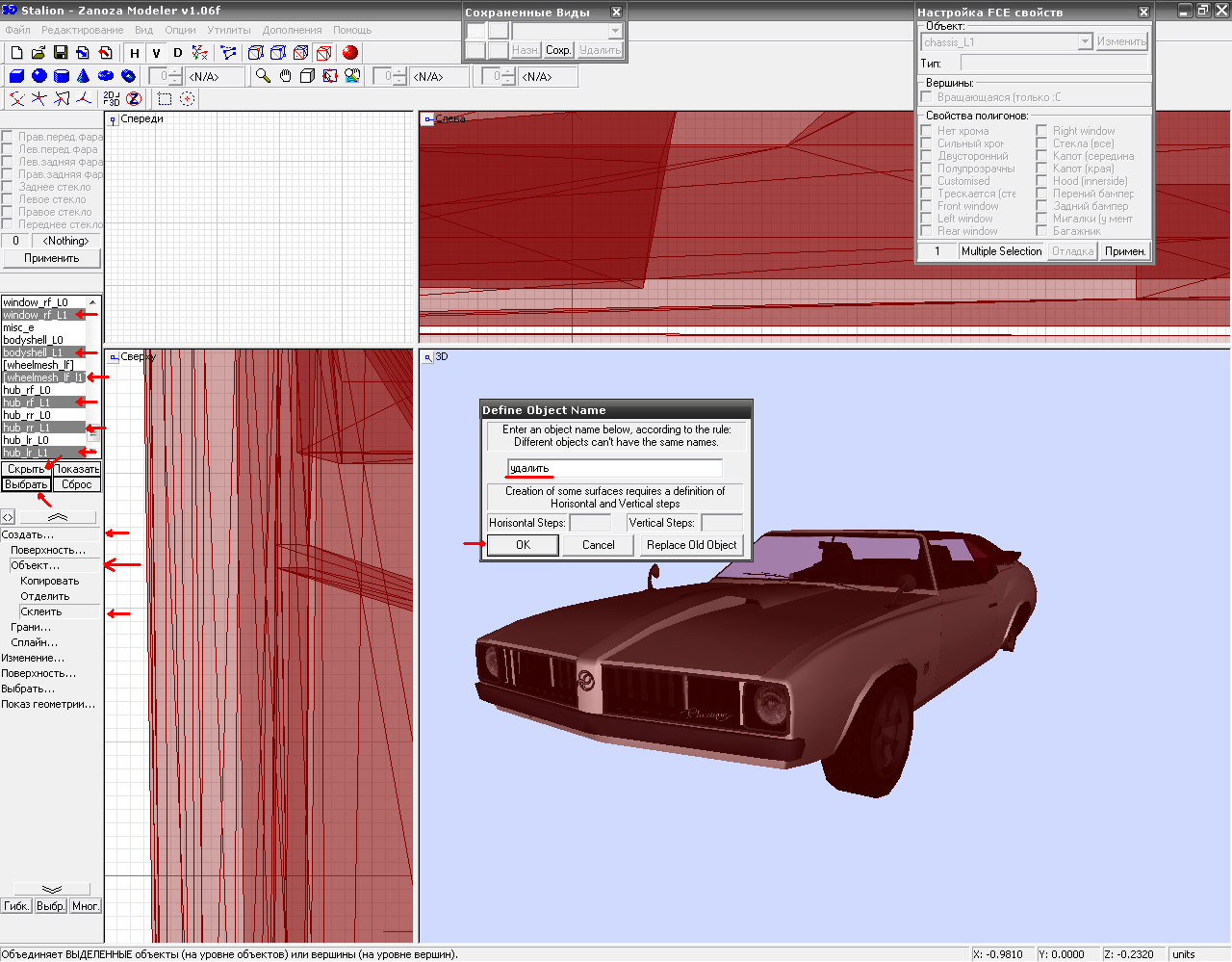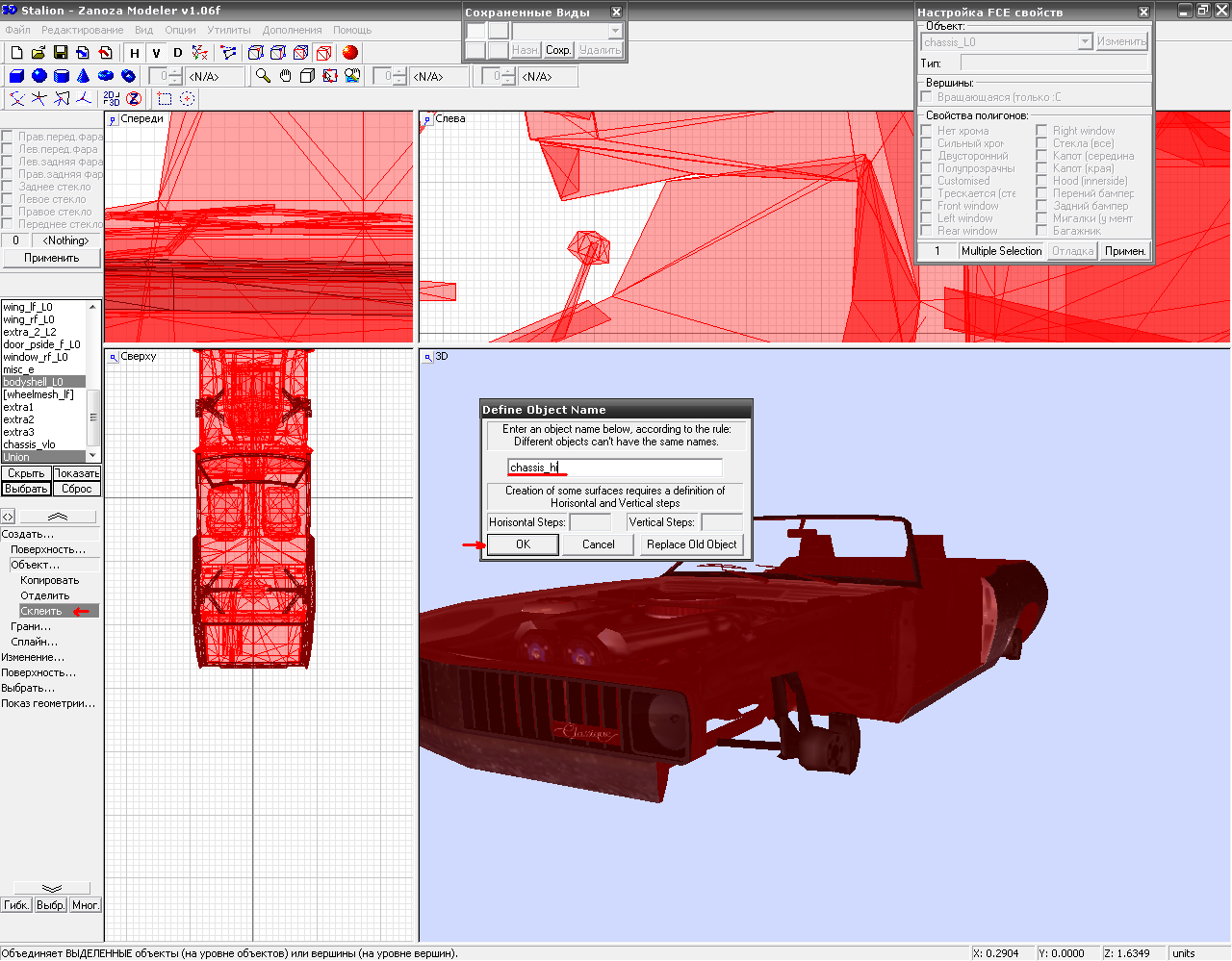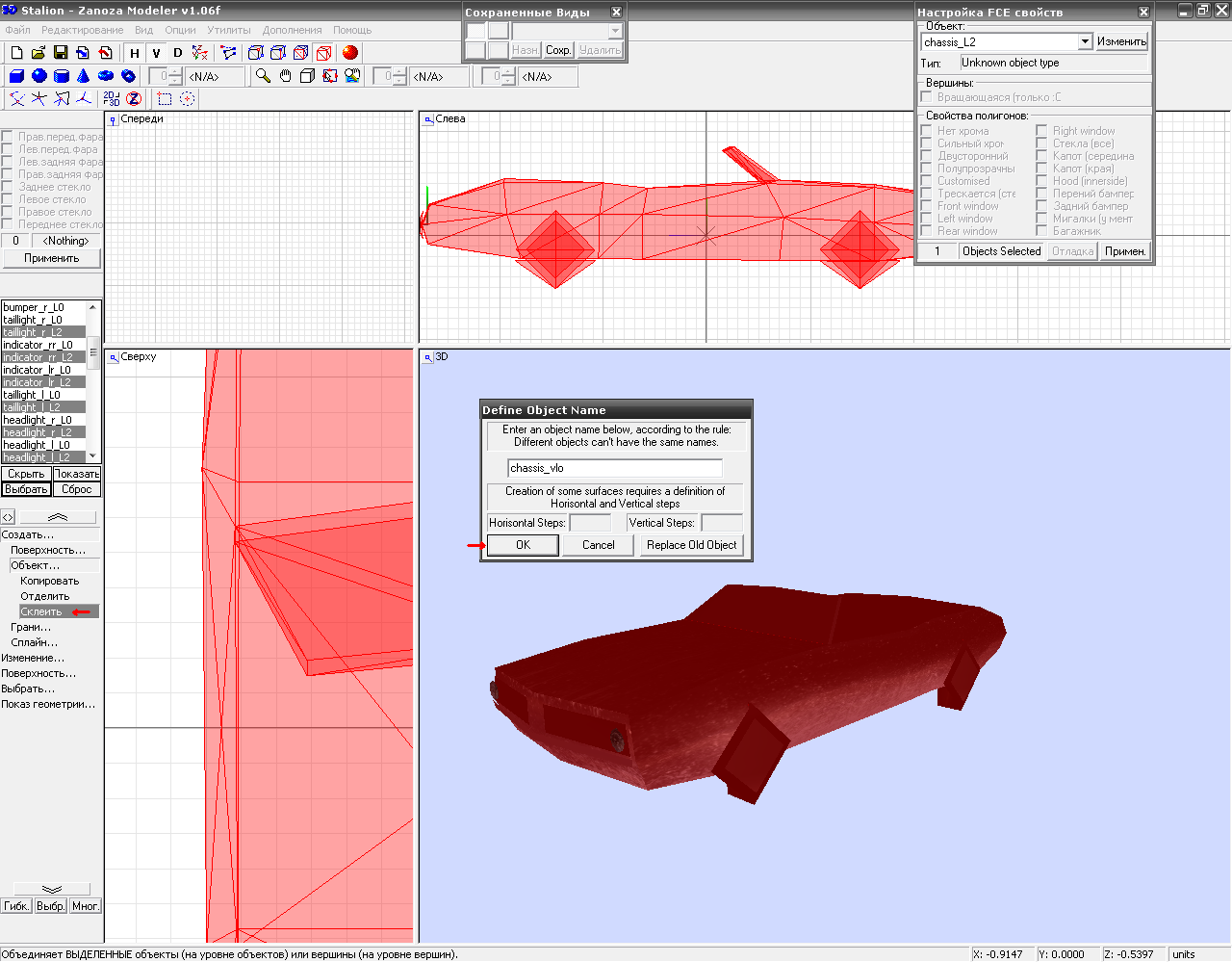 Теперь самая главна часть конверта. Открываем .z3d фаил ZModeler'ом 1. Слева или справа (у кого как; у меня он слева) видим длинный список. Сейчас будем его разбирать. У нас есть объекты, которые оканчиваются на L0, L1 и L2. Это означает уровень детализации: L0 - хорошая детализация, L1 - средняя и L2 - плохая (это уже LOD). L1 нам не нужен, так что его можно удалять. Перед этим рекомендую сделать копию нашей z3d сцены. Итак удаляем все объекты, которые оканчиваются на L1 (chassis_L1, door_dside_f_L1, windscreen_L1 и т.д). Для начала жмём на Скрыть, затем в списке выбираем объекты, которые оканчиваются на L1, жмём Выбрать. Под списком есть команды. Щёлкаем на Создать...\Объект\Склеить и щёлкаем на виде Спереди, Сзади или Сверху (у кого как). Вылезет окно Define Object Name. Называем его как угодно, жмём ОК
