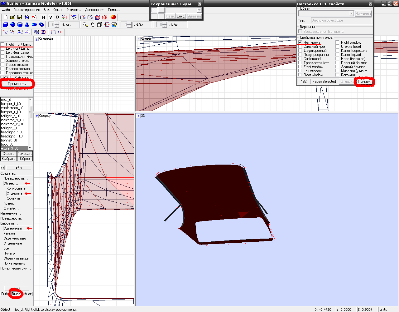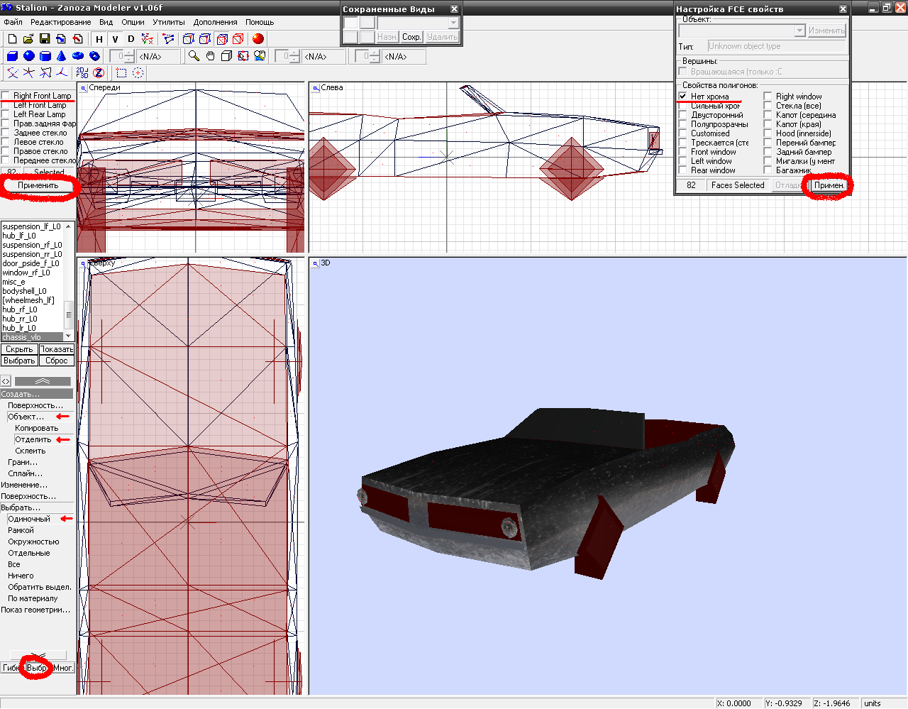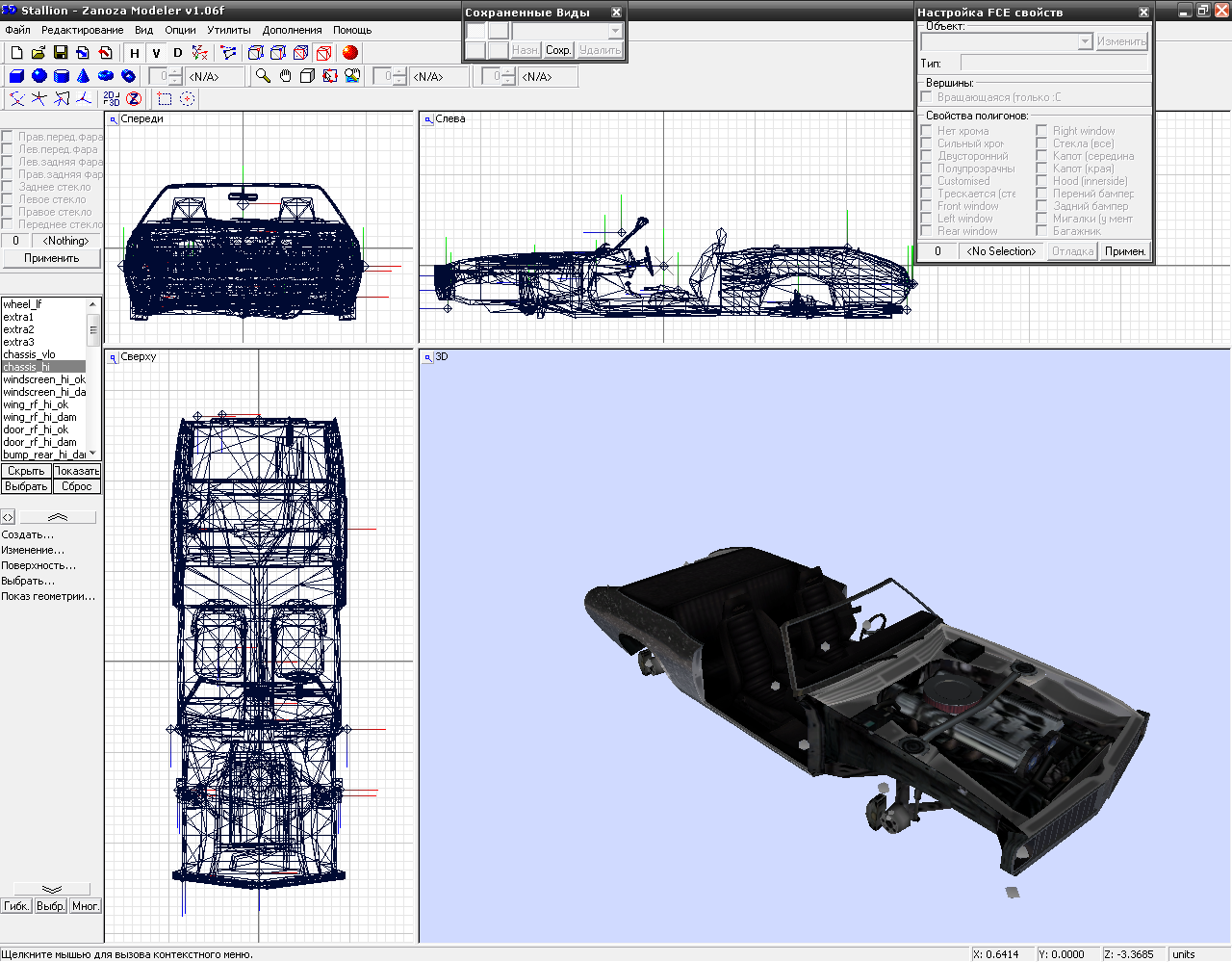 Готово, но ещё нужно настроить хром. Идём во вкладку Выбрать, выбираем Одиночный (или Рамкой), в самом низу щёлкаем на Выбр. Теперь на Создать...\Объект\Отдлеить и правой кнопкой мыши выбираем полигоны, на которых не будет хрома. В Настройка FCE свойств (если её нет, то идём в Дополнения\Настройка FCE свойств) ставим галочку на Нет хрома, жмём Примен. В Настройка C3D автоматически поставится галочка на Right Front Lamp. Снмаем её, нажимаем Применить.