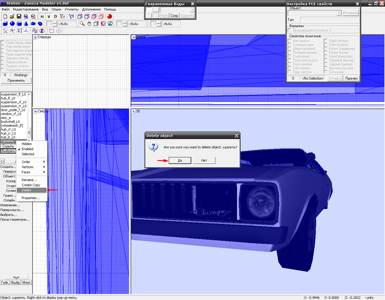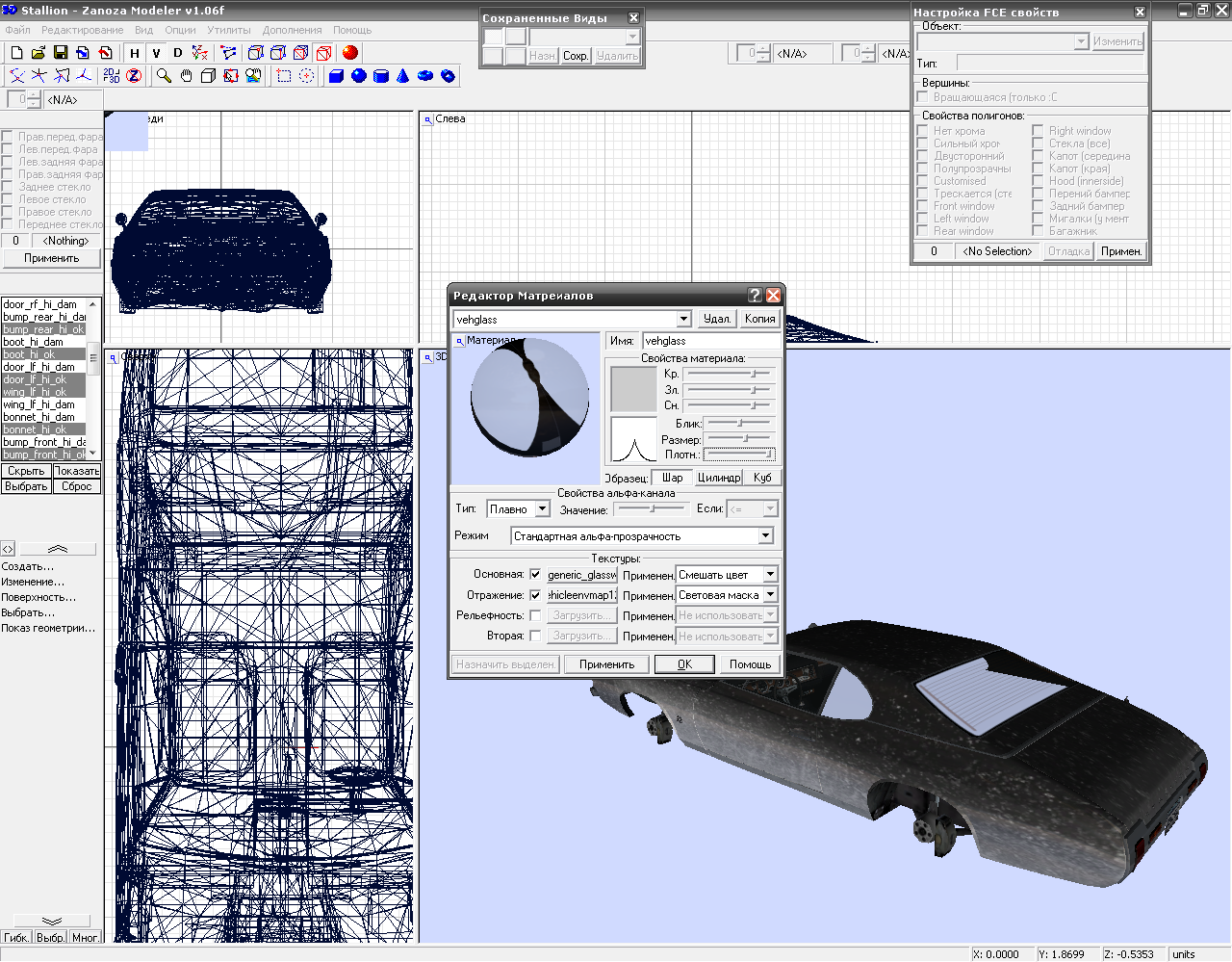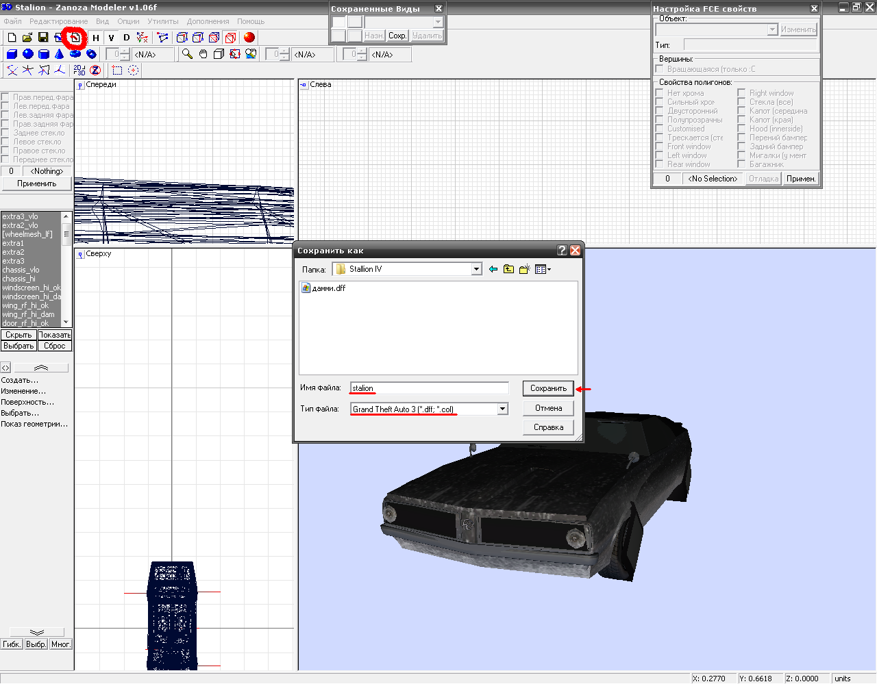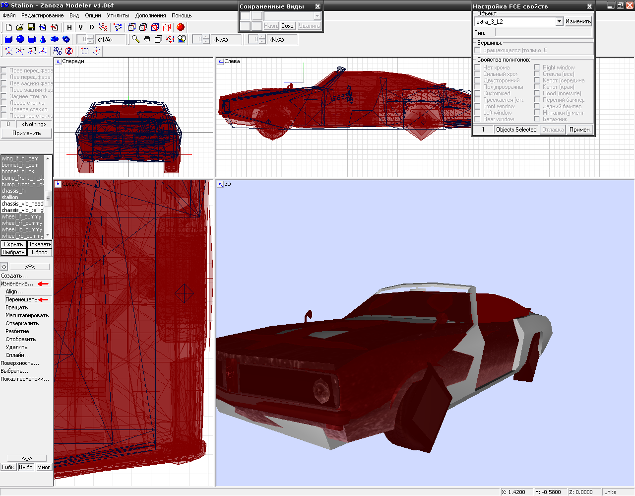 Готово, но ещё нужно настроить хром. Идём во вкладку Выбрать, выбираем Одиночный (или Рамкой), в самом низу щёлкаем на Выбр. Теперь на Создать...\Объект\Отдлеить и правой кнопкой мыши выбираем полигоны, на которых не будет хрома. В Настройка FCE свойств (если её нет, то идём в Дополнения\Настройка FCE свойств) ставим галочку на Нет хрома, жмём Примен. В Настройка C3D автоматически поставится галочка на Right Front Lamp. Снмаем её, нажимаем Применить.