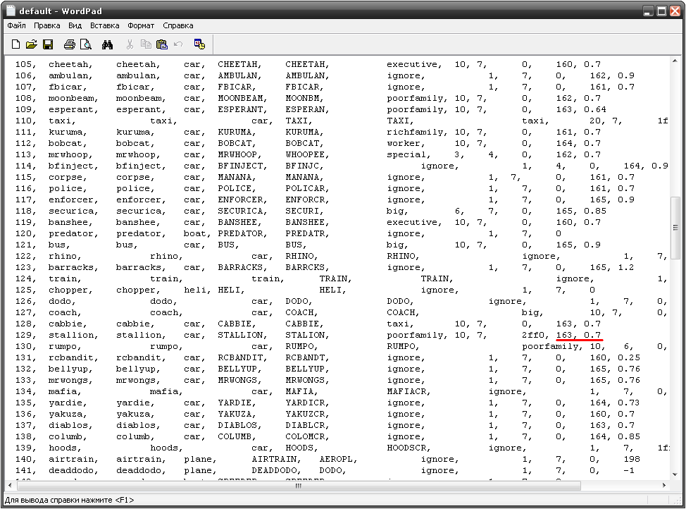 Дамми настроены, модель готова. Почти. Нужно выравнять колёса. В default.ide ищем строчку нашего авто (129, stallion, stallion,...).