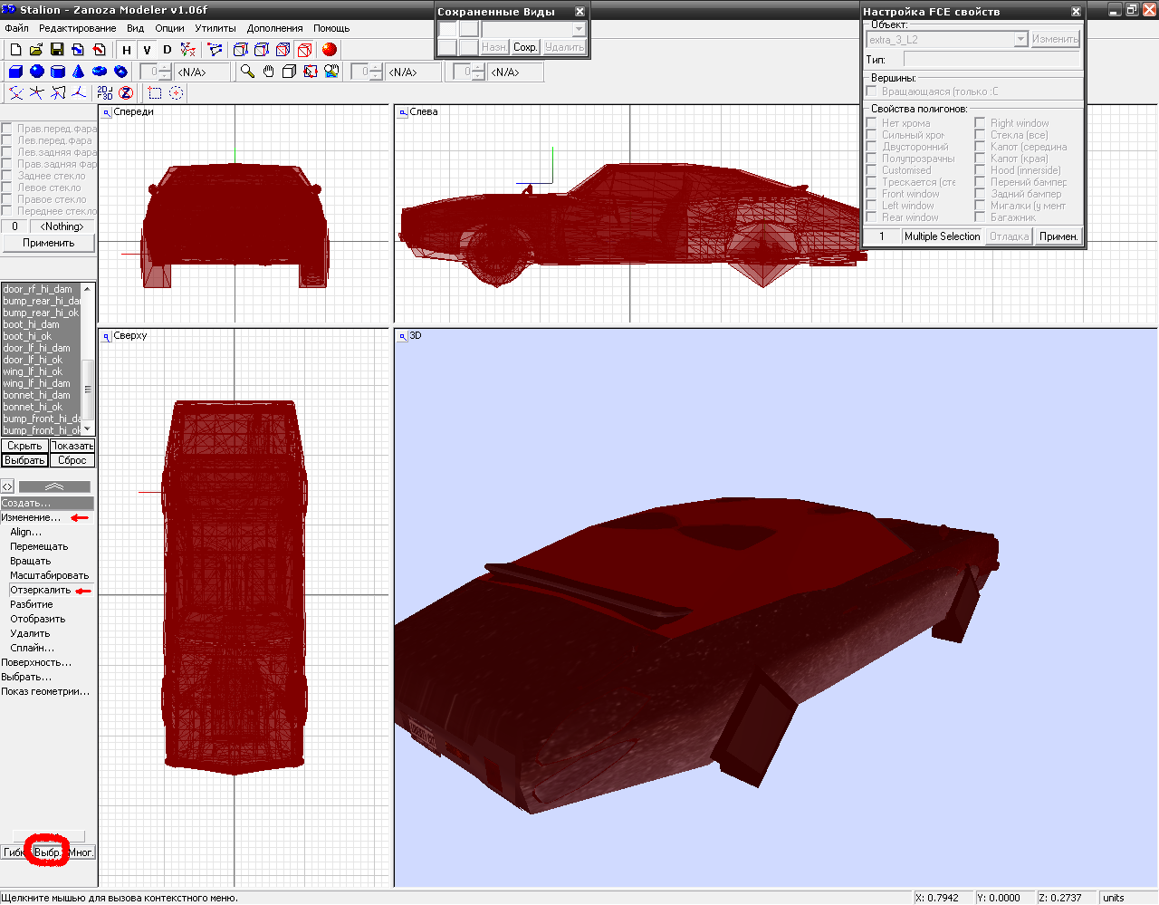 Возвращаемся к Сталлиону из четвёрки. Нам нужно развернуть авто на 180 градусов. Для этого выбираем все объекты, в нижнем углу кликаем на Выбр, идём в Изменение\Отзеркалить и щёлкаем по виду сверху один раз. Готово, объеты развёрнуты. Выбор объектов не снимаем