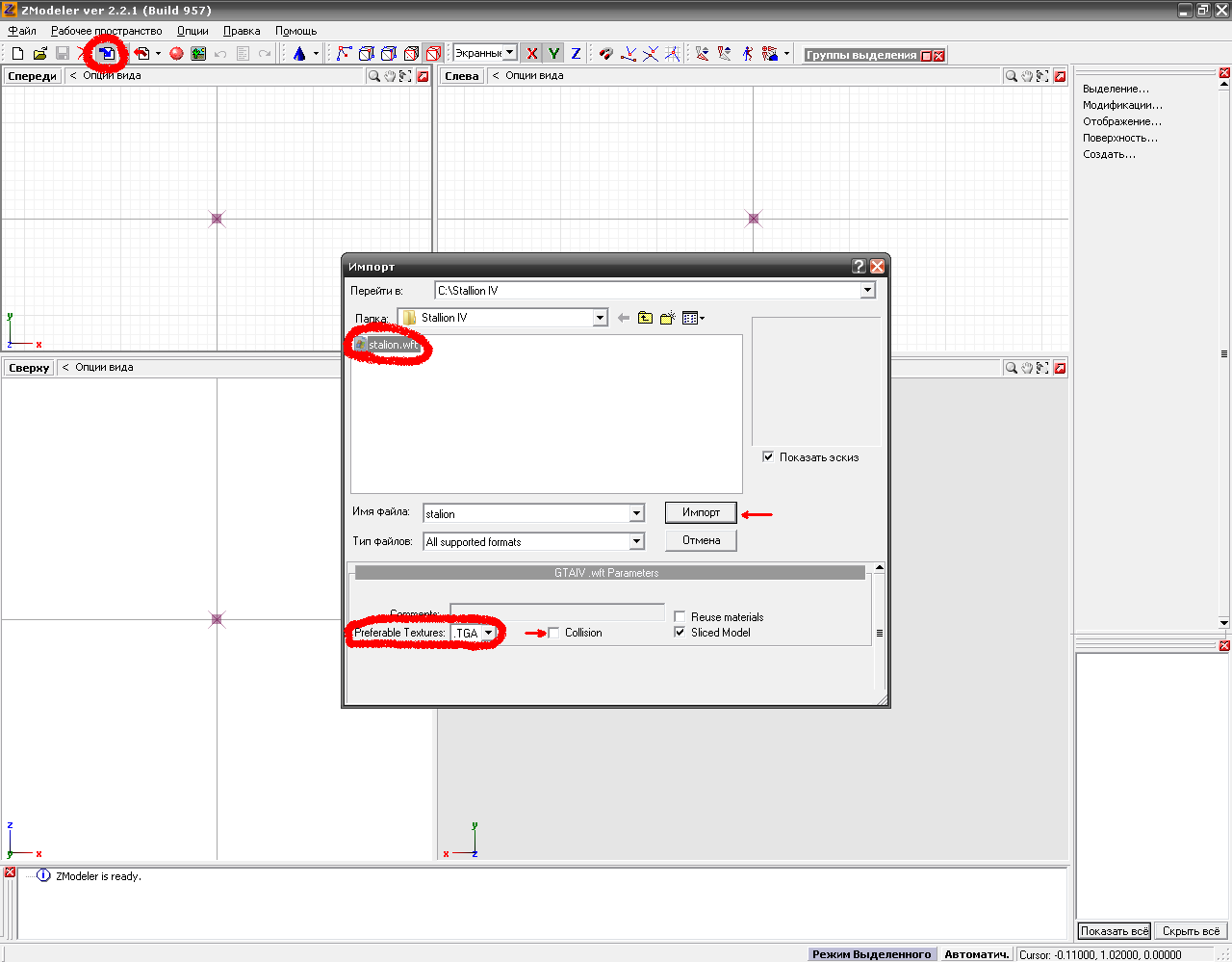 Текстуры извлечены, теперь можно импортировать модель. В ZModeler 2.2.1 нажимаем на Импорт и выбираем нашу модель. Теперь смотрим в GTAIV .wft Parameters: в Preferable Textures выбираем наш формат текстур (у нас был .tga), галочку с Collision снимаем т.к коллизия автомобиля нам пока что не нужна (как нибудь потом допишу про неё), галочка на Sliced Model должна быть, на Resue materials нет. Жмём на Импорт